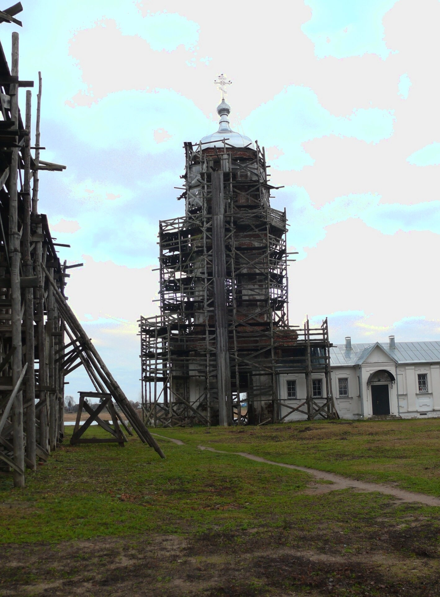 На представленной фотографии запечатлена колокольня Свято-Троицкого Михайло-Клопского монастыря, одной из древних православных обителей Новгородской земли, расположенной вблизи озера Ильмень. Многоярусное сооружение, увенчанное главкой с крестом, находится на этапе проведения реставрационных работ, о чём красноречиво свидетельствуют окружающие его деревянные строительные леса. Данные восстановительные мероприятия направлены на сохранение уникального архитектурного памятника XVI–XIX веков для будущих поколений.