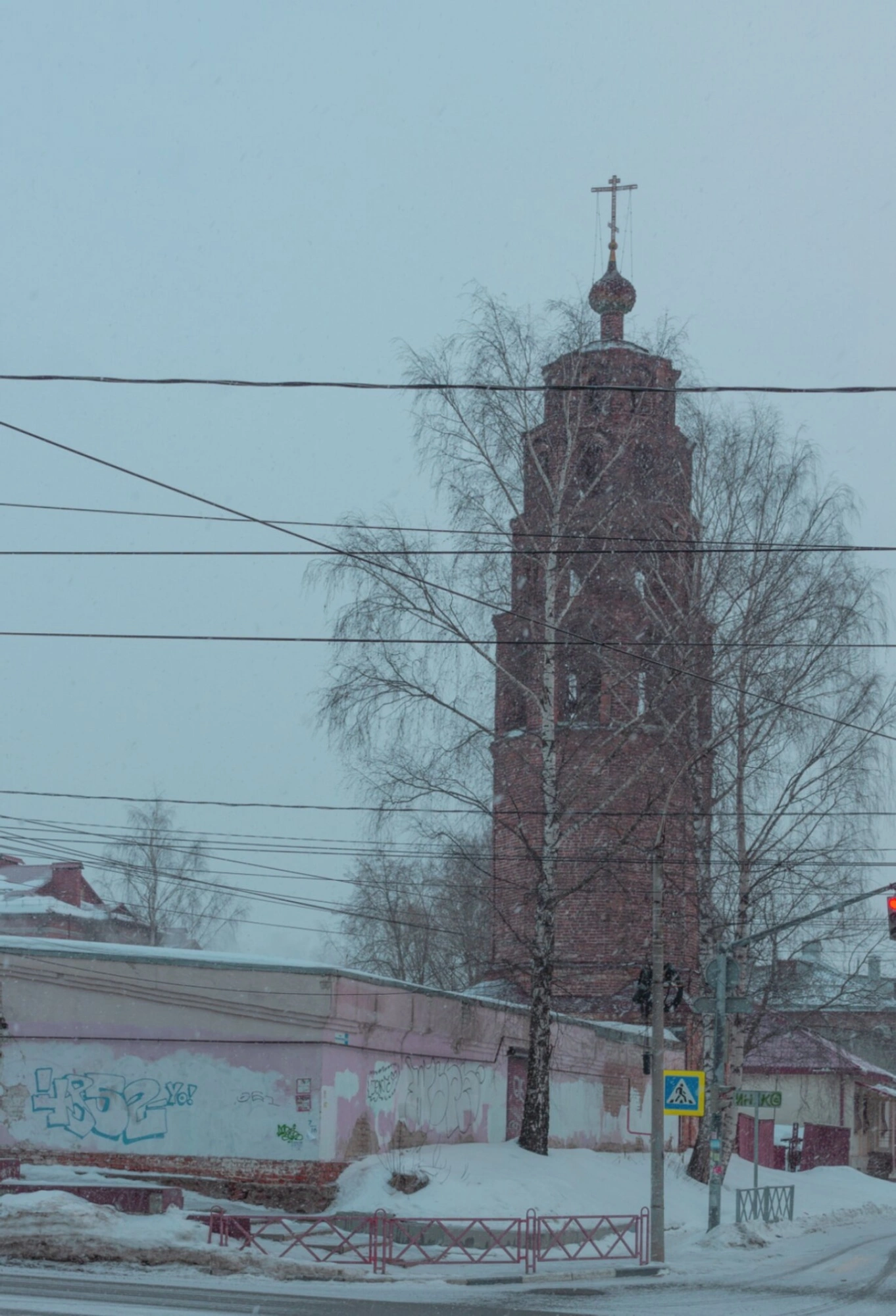 На заднем плане просматриваются элементы городской застройки, соседствующие с храмовым комплексом. Провода и светофорные столбы напоминают о современном контексте существования древней святыни. Колокольня Никитского прихода представляет собой важный историко-культурный объект, сохраняющий духовное наследие Ярославской земли.