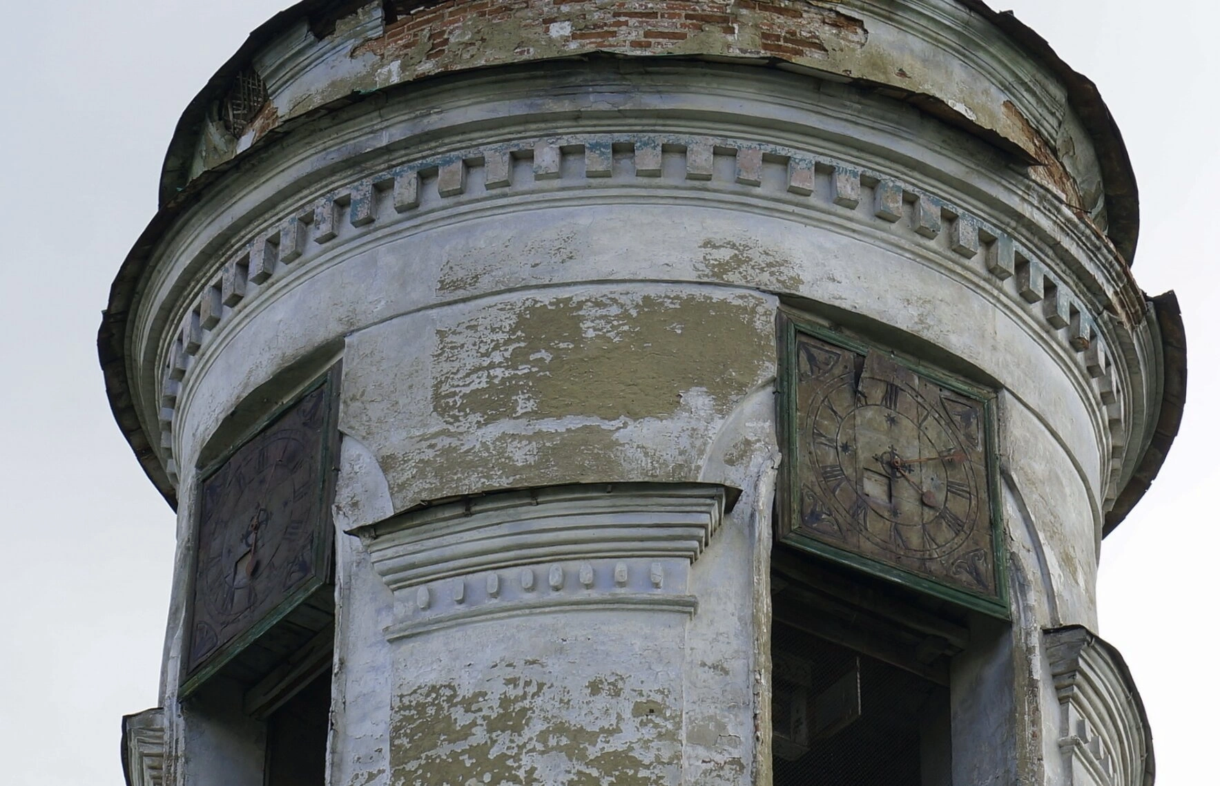 Под карнизом просматриваются элементы лепного декора и архитектурные детали, характерные для православного зодчества Уральской земли. Проёмы, в которых установлены циферблаты, арочной формы, что традиционно для колоколен данного периода. Общий вид свидетельствует о необходимости срочных реставрационных работ для сохранения этого уникального духовного и культурного наследия для будущих поколений.