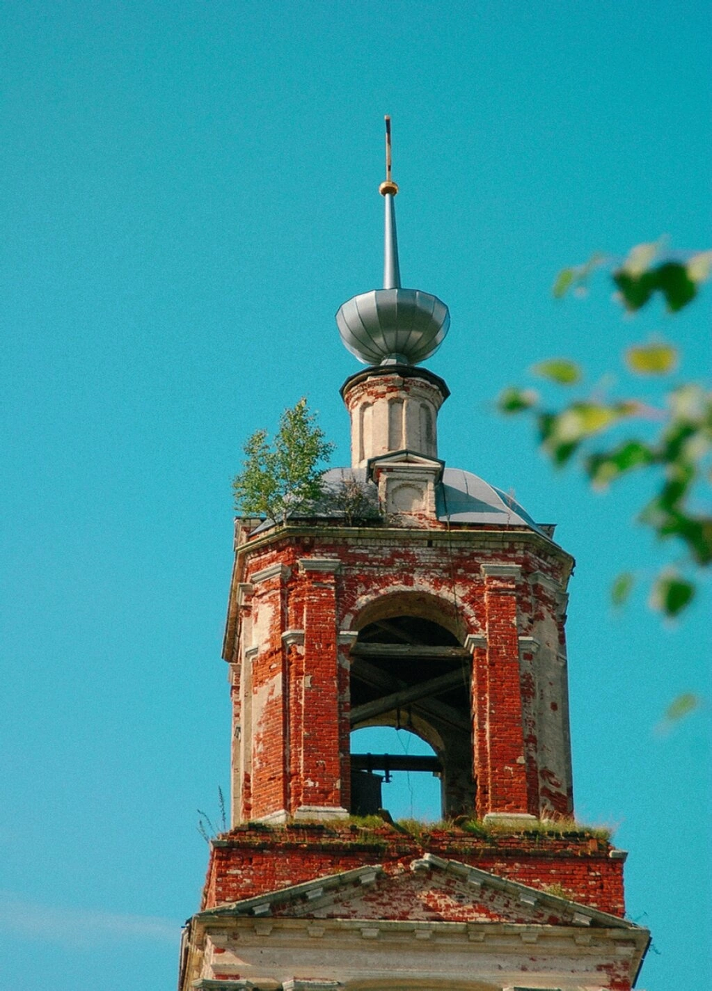 Верхняя часть колокольни, выполненная из красного кирпича, демонстрирует характерные для церковной архитектуры своего времени арочные проёмы звонницы. Сооружение венчает купол серого цвета со шпилем и православным крестом, устремлённым в небеса. В настоящее время на конструкции видны следы естественного старения и прорастающая растительность, что свидетельствует о непростой истории храма в советский период, когда он был закрыт и постепенно разрушался.