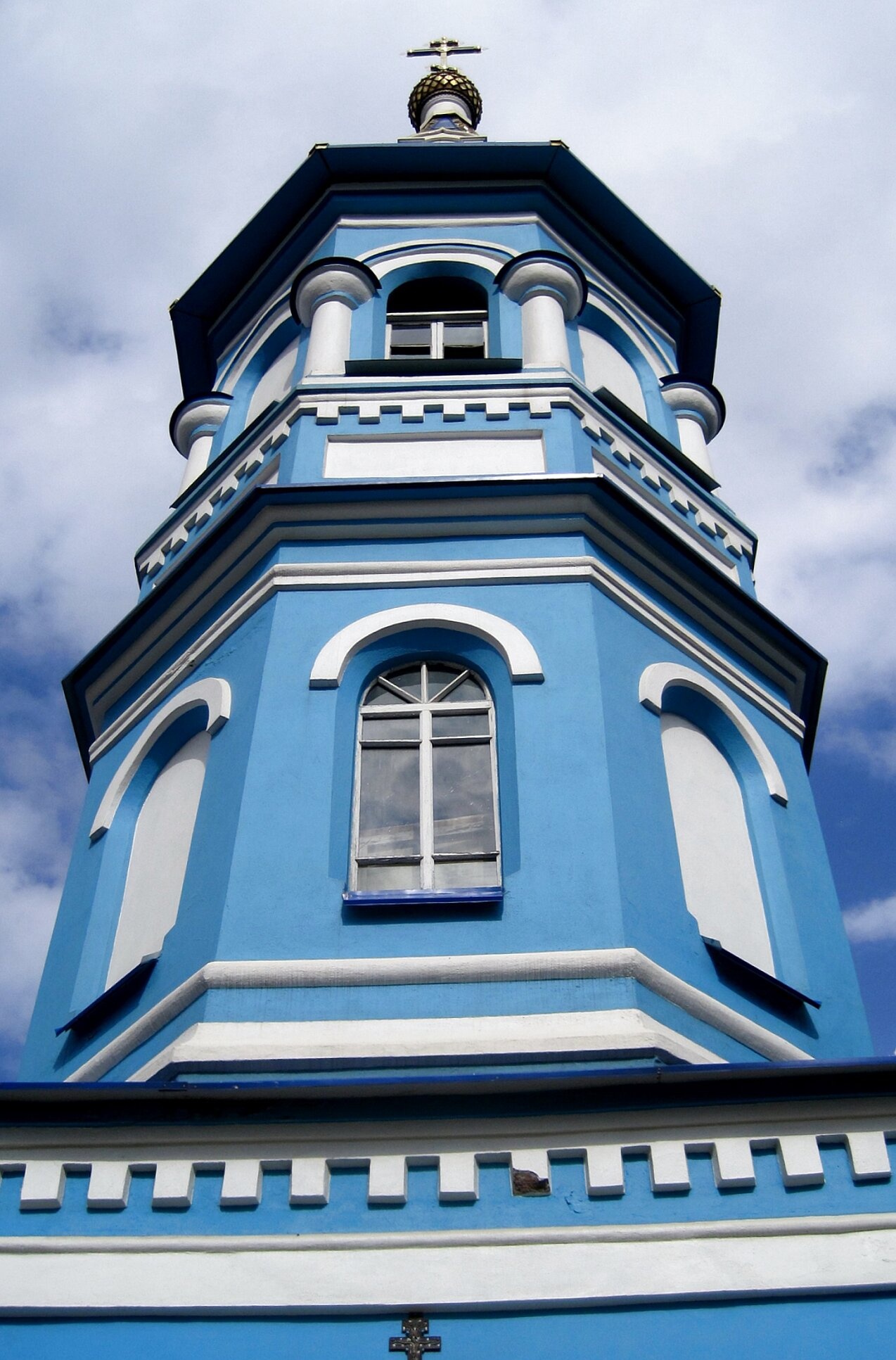 Колокольня, изображённая на снимке, представляет собой величественное сооружение, выполненное в классическом архитектурном стиле. Её верхний ярус, окрашенный в небесно-голубые и белые тона, украшен изящными колоннами и арочными проёмами, в которых размещаются церковные колокола. Завершает колокольню золочёный купол, сияющий в лучах солнца и увенчанный восьмиконечным православным крестом, символизирующим спасение.
