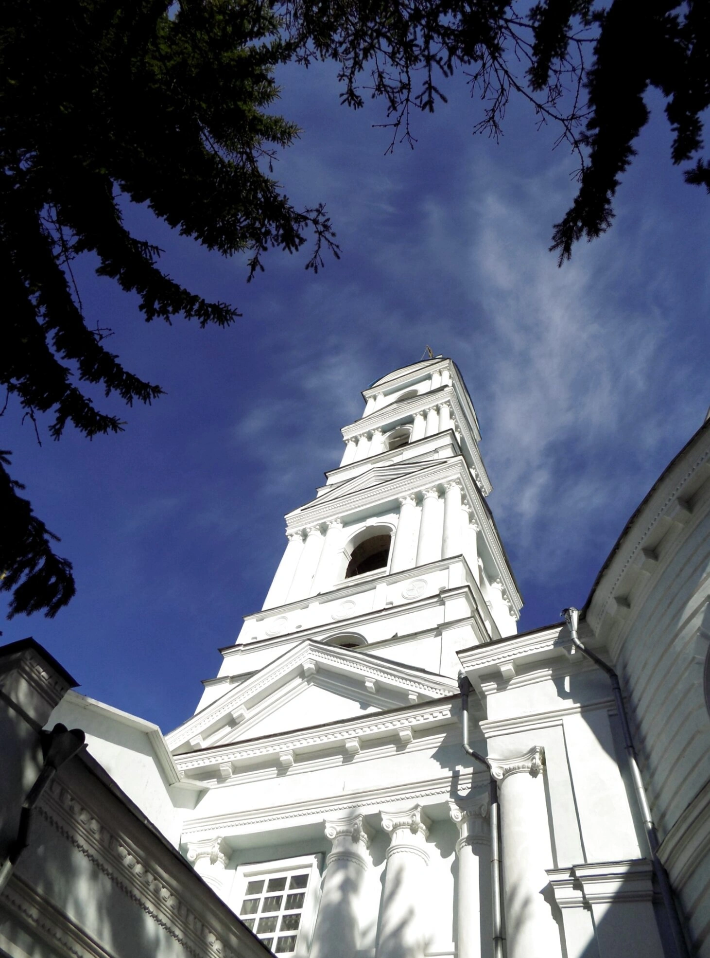 На фотографии запечатлена величественная колокольня старинного Покровского храма, что располагается в древнем граде Рыльске Курской области. Снимок сделан с нижнего ракурса, что подчёркивает монументальность и устремлённость сооружения ввысь, к небесам. Белоснежный ярусный столп колокольни эффектно выделяется на фоне чистого голубого неба, а обрамляющие верхнюю часть кадра ветви деревьев придают изображению живость и естественность.
