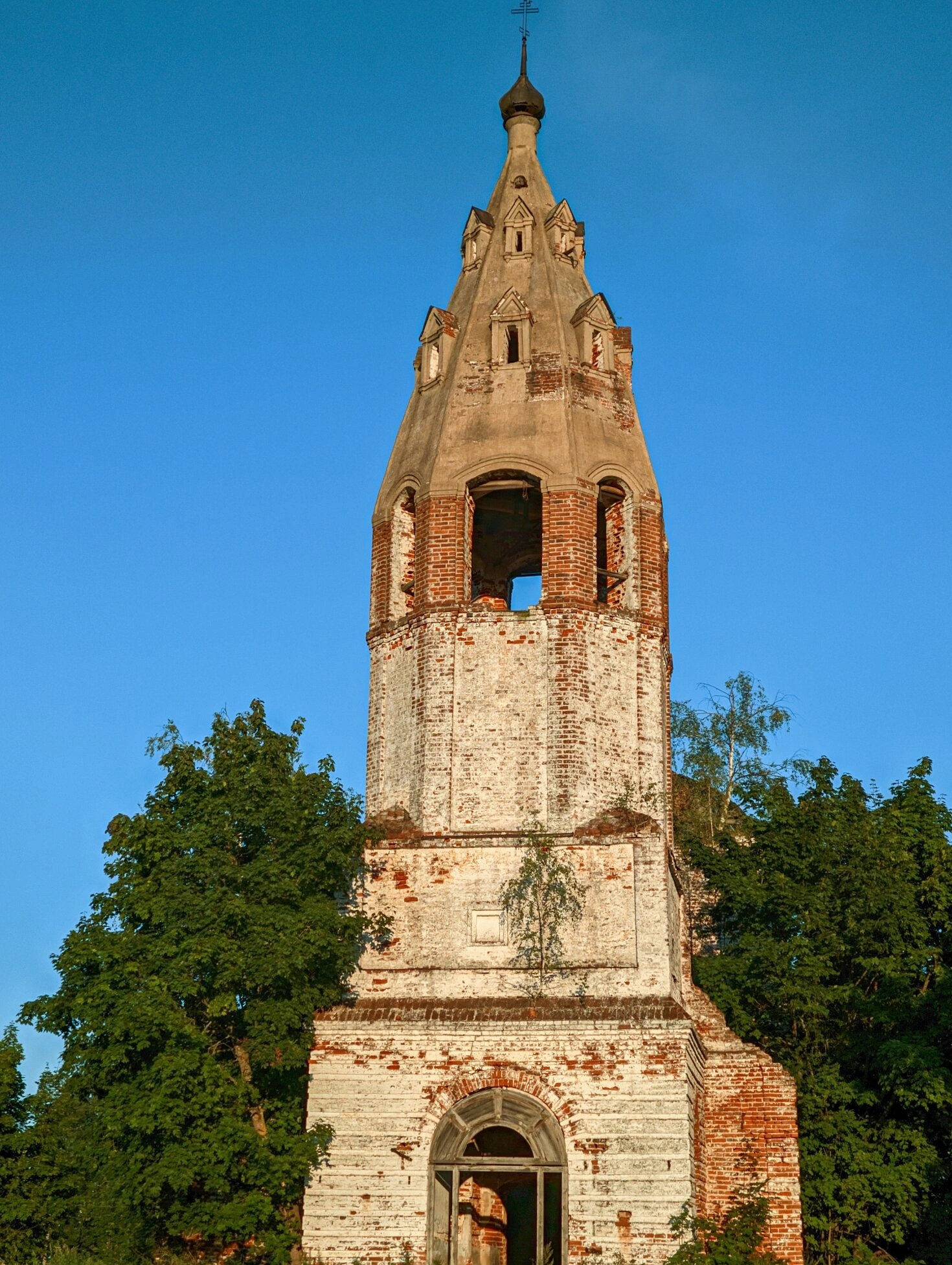 На представленной фотографии запечатлена колокольня Церкви Покрова Пресвятой Богородицы, расположенная в селе Брюхово Ивановской области. Это всё, что осталось от некогда величественного храмового комплекса, являющегося памятником православной архитектуры.