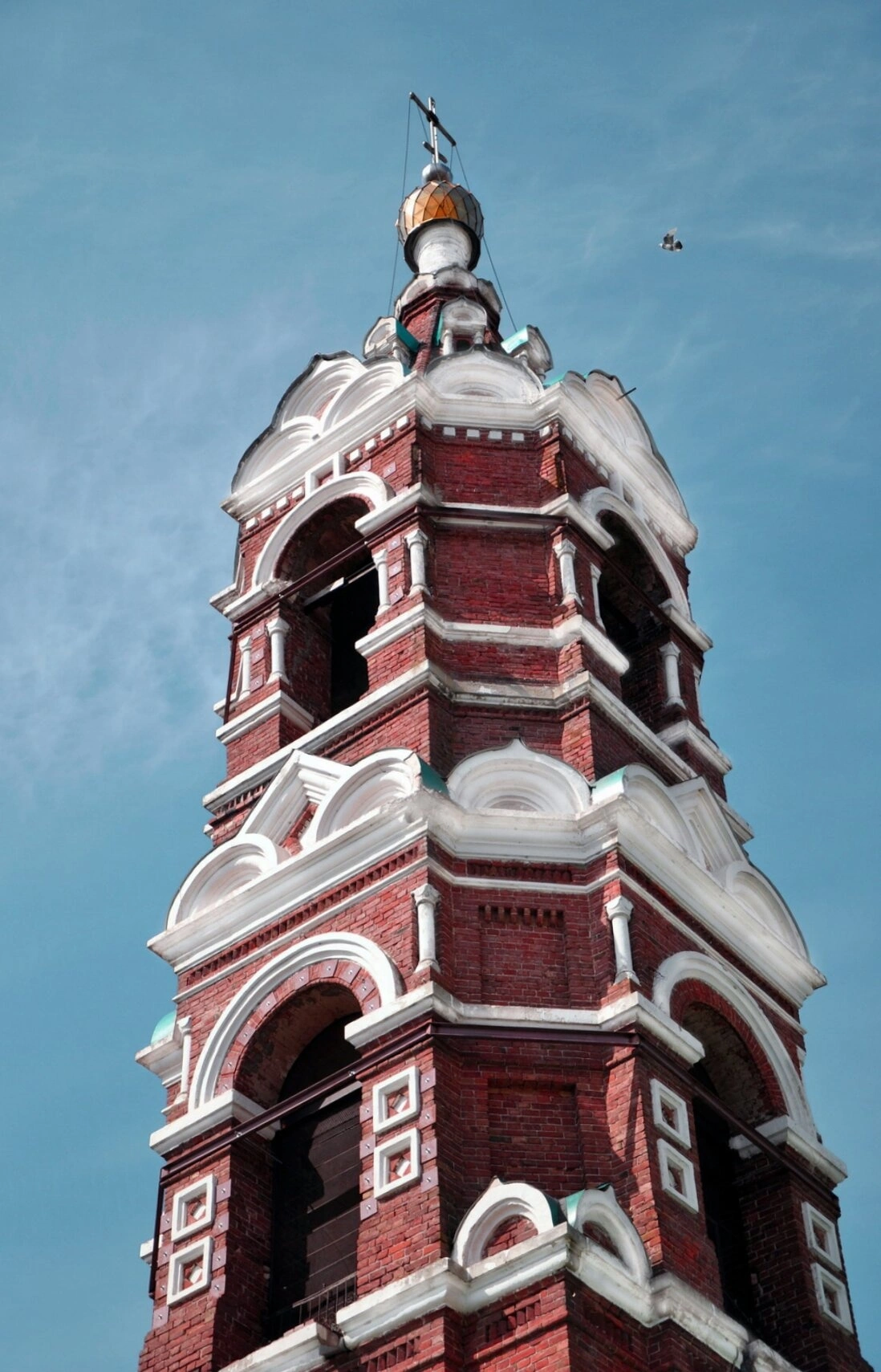 Кирпичная колокольня, увенчанная золочёным куполом с водружённым на него православным крестом, поражает своей строгой красотой и гармонией пропорций. Фасад украшен белыми декоративными элементами и арочными проёмами яруса звона, где в былые времена размещались церковные колокола, чей звон разносился над окрестными полями и хуторами. Белоснежные детали, контрастирующие с краснокирпичной кладкой, придают сооружению нарядный и праздничный вид, характерный для храмового зодчества того периода.