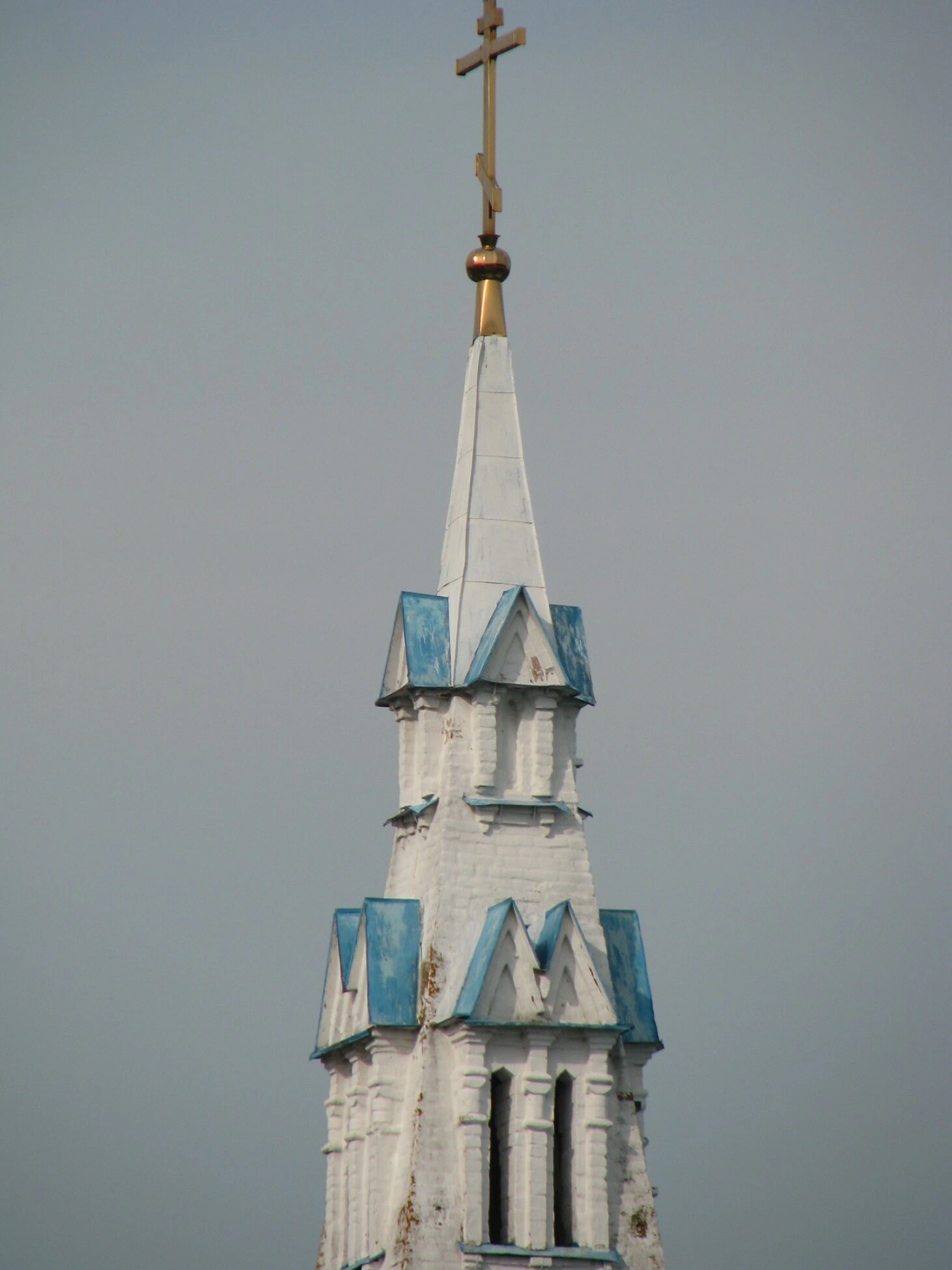 Колокольня представляет собой величественное сооружение, увенчанное высоким конусообразным шпилем. Шпиль окрашен в белый цвет и завершается золочёным яблоком, на котором воздвигнут православный крест, символизирующий победу жизни над смертью и искупительную жертву Христа. Синяя кровля, местами утратившая первоначальную целостность, создаёт яркий цветовой акцент и напоминает о небесной славе.
