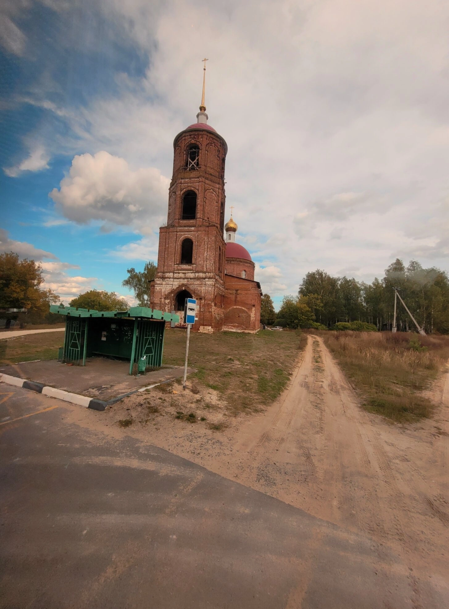 Перед храмом проходит грунтовая дорога, разделяющаяся на два направления. С правой стороны от дороги расположена автобусная остановка, отмеченная стандартным синим знаком. Параллельно грунтовой дороге проходит асфальтированная трасса с дорожной разметкой, что свидетельствует о расположении храма вблизи транспортных путей.