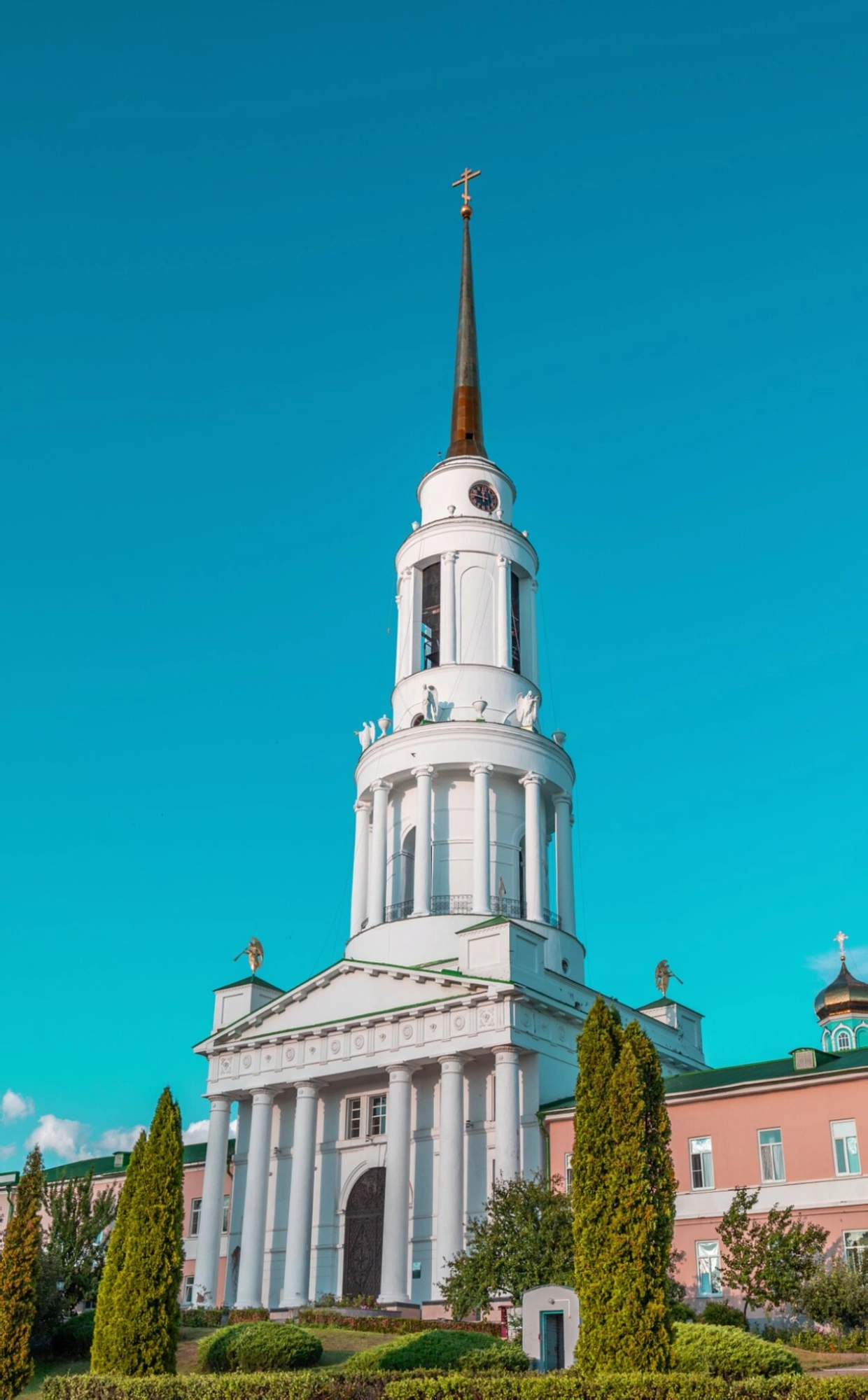 На представленной фотографии запечатлена величественная колокольня с храмом во имя Святителя Николая Чудотворца, расположенная на территории Задонского Рождество-Богородицкого мужского монастыря в городе Задонске Липецкой области. Белоснежное сооружение с золочёным шпилем устремляется ввысь, символизируя молитвенное горение человеческой души к Богу.