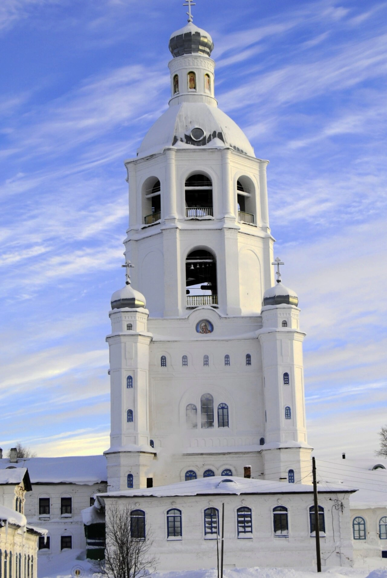 Снимок сделан в зимнее время, когда земля и кровли окружающих монастырских построек покрыты нетронутым снежным покровом. Чистый белый цвет снега контрастирует с яркой белизной стен колокольни и лазурью безоблачного неба, наполняя пейзаж ощущением благоговейной тишины, чистоты и покоя, свойственных святой обители. Троице-Стефано-Ульяновский монастырь, действующий и поныне, был возобновлён в 1860 году и переживал свой расцвет благодаря трудам братии, прибывшей из Соловецкой обители во главе с архимандритом Матфеем. Успенский храм в колокольне — свидетель тех времён активного каменного строительства, когда монастырь обрёл свой неповторимый архитектурный облик, став духовной твердыней на берегу реки Вычегды.