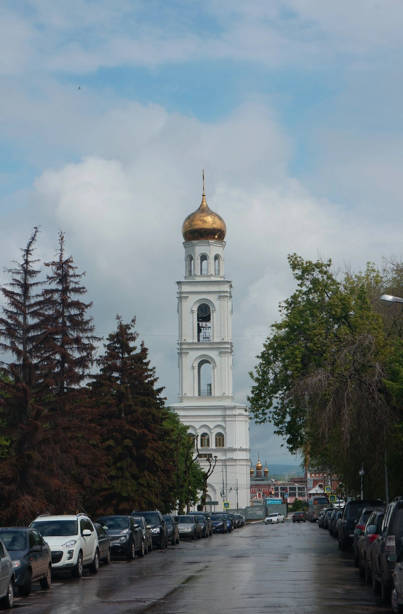 На фотографии запечатлена величественная колокольня Самарского Иверского женского монастыря, являющаяся одной из архитектурных доминант исторической части города. Белоснежное четырёхъярусное сооружение, увенчанное золочёным куполом и православным крестом, устремляется ввысь, символизируя духовное горение и молитвенное предстояние перед Господом.