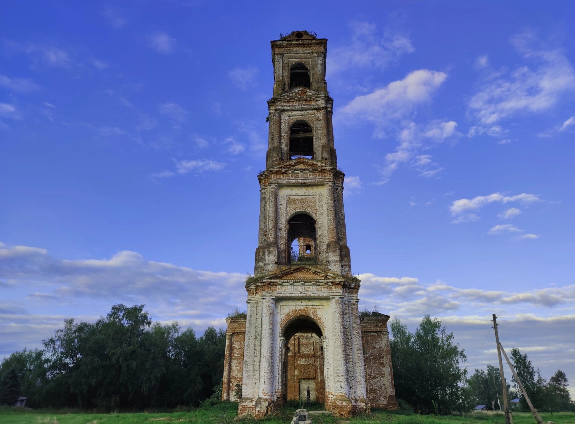 На представленной фотографии запечатлена колокольня утраченного ныне храма в честь Смоленской иконы Божией Матери, что располагалась в селе Армёнки Нерехтского района Костромской области. Многоярусное кирпичное сооружение, возведённое в традициях русской церковной архитектуры, ныне пребывает в полуразрушенном состоянии, являясь безмолвным свидетелем былого величия.