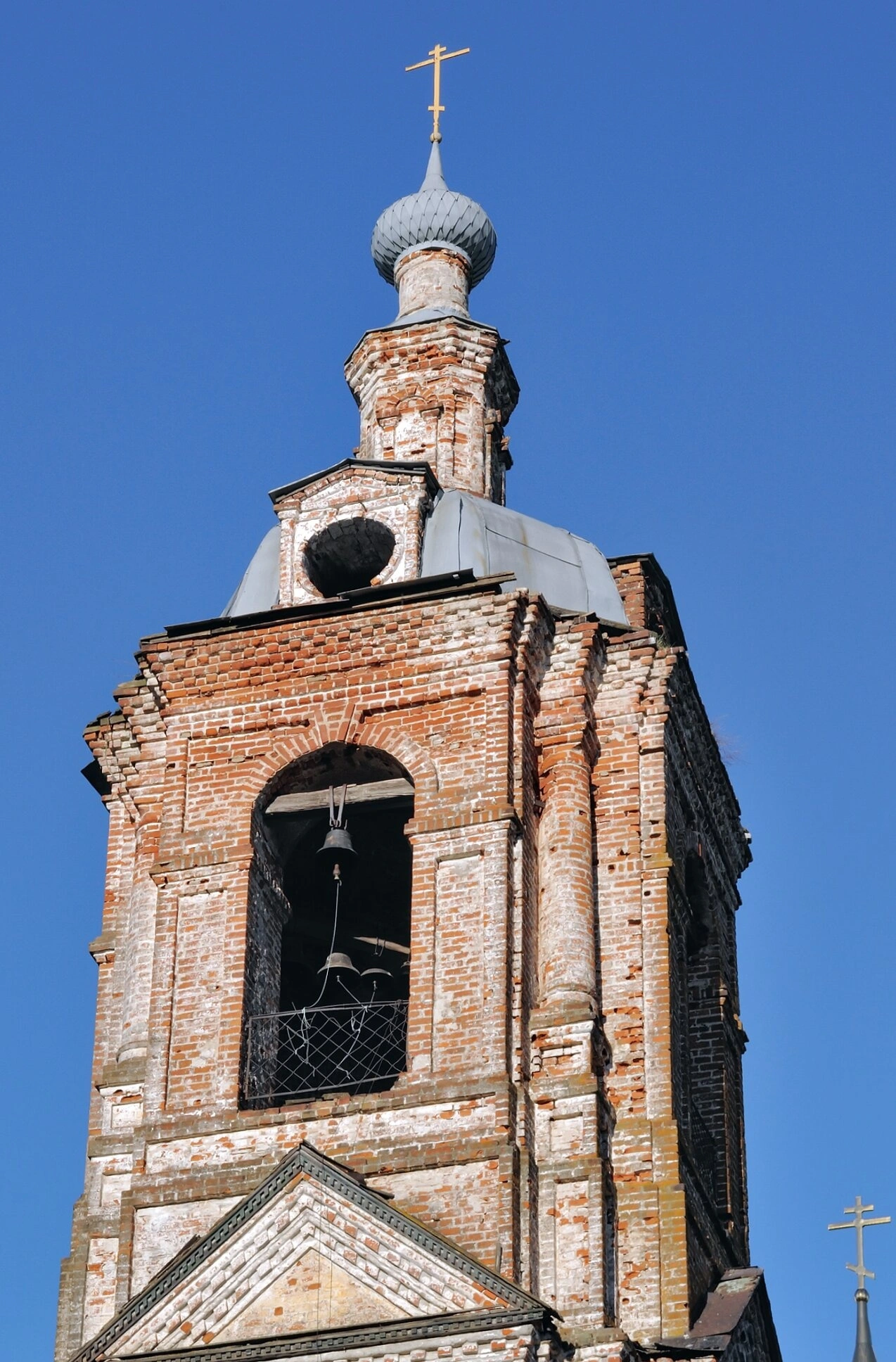 На представленной фотографии запечатлена колокольня храма в честь Смоленской иконы Божией Матери, расположенного в селе Фёдоровское Ярославской области. Это архитектурное сооружение является важным элементом православного храмового комплекса, выполняющим сакральную функцию призыва верующих к богослужению.