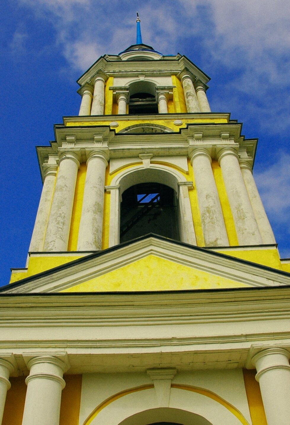 На фотографии запечатлена колокольня Церкви Смоленской иконы Божией Матери, расположенной в селе Ильинское Кимрского района Тверской области. Храм был возведен в 1796 году и представляет собой ценный памятник церковной архитектуры конца XVIII века.