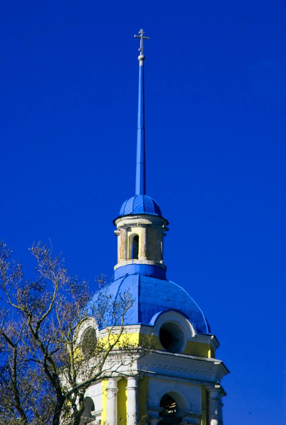 На фотографии запечатлена колокольня храма в честь Смоленской иконы Божией Матери, расположенного в селе Ильинское Кимрского района Тверской области. Высокий шпиль, увенчанный православным крестом, устремляется в небесную высь, символизируя молитвенное горение и духовную связь земного с горним.