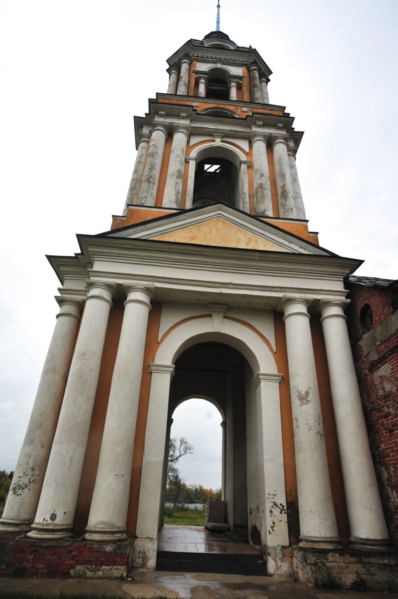 На представленной фотографии запечатлена колокольня храма в честь Смоленской иконы Божией Матери, расположенного в селе Ильинское Кимрского района Тверской области. Многоярусное сооружение представляет собой выдающийся образец церковной архитектуры периода классицизма.
