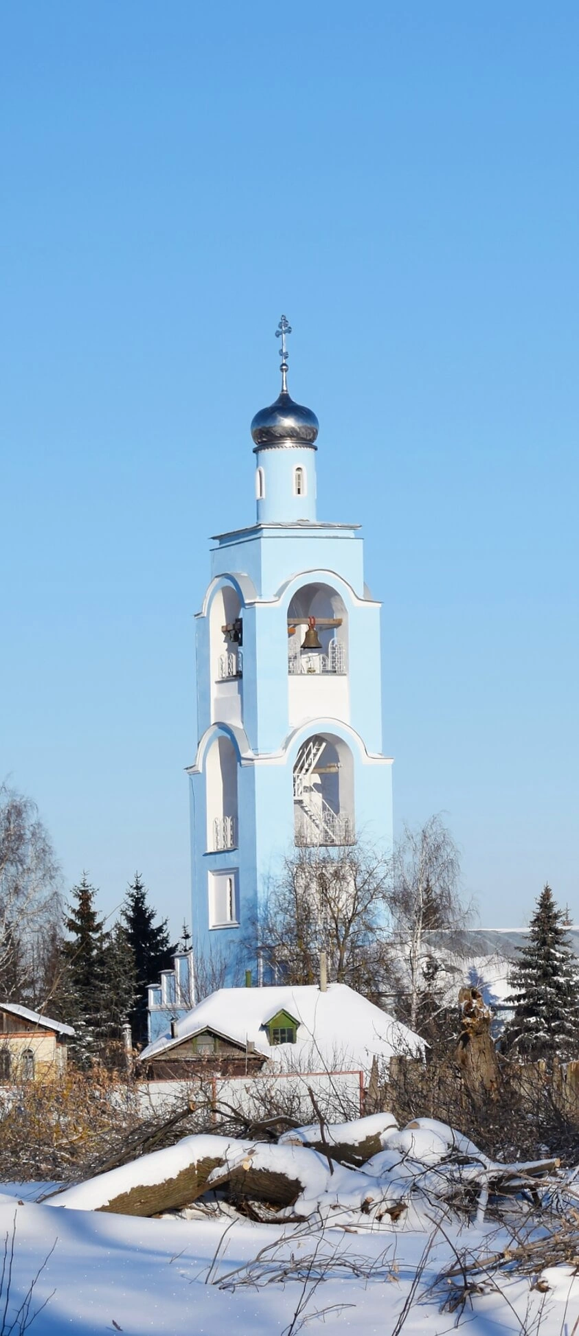 Колокольня, возвышающаяся над заснеженными деревьями и городскими постройками, представляет собой величественное сооружение, выполненное в традициях русской церковной архитектуры. Её стройный силуэт символизирует устремлённость верующих к горнему миру, а ярусы звона предназначены для возвещения благовестия на всю округу.