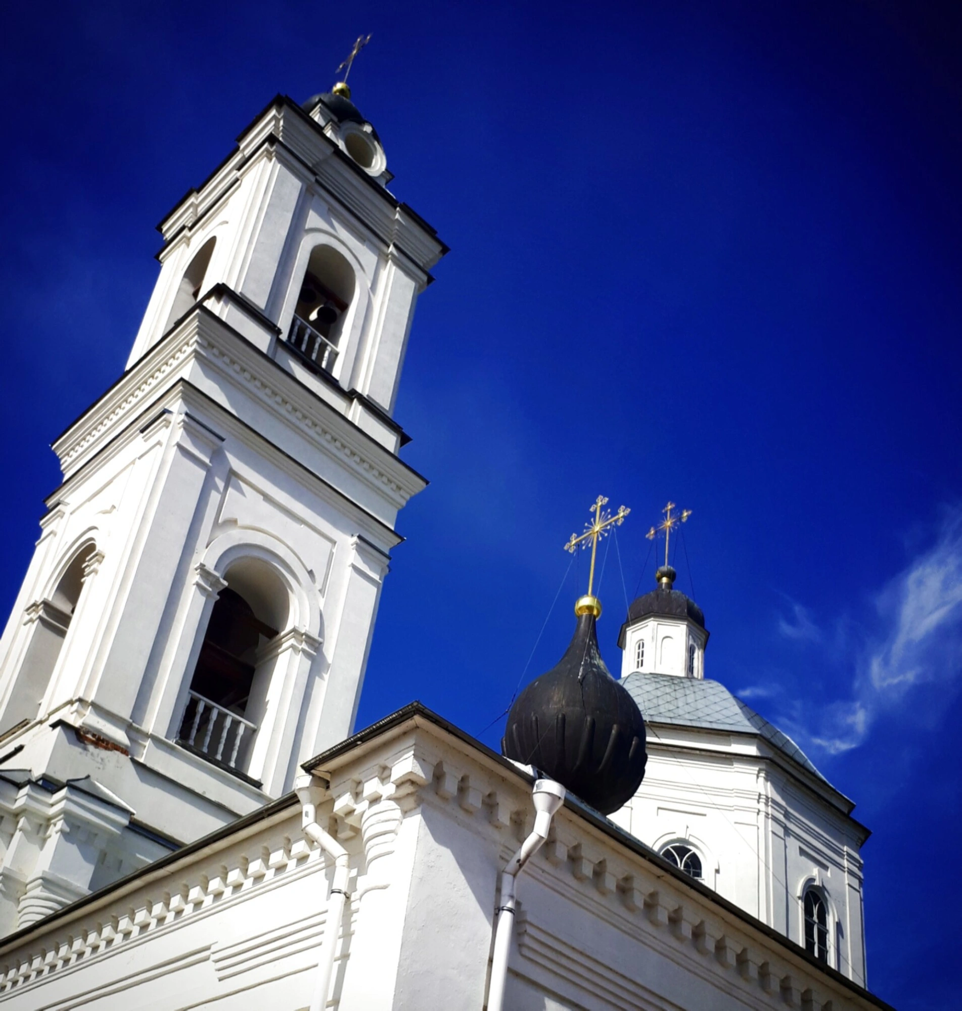 Собор Петра и Павла, чья колокольня изображена на снимке, является духовным центром Тарусы и одной из её главных архитектурных доминант. Его история неразрывно связана с жизнью города и его благочестивых жителей. Чистое безоблачное небо, служащее фоном для святой обители, подчёркивает её величие и чистоту, создавая настроение тихой молитвенной радости и благовения перед красотой Божьего мира. Этот образ наполнен благодатным светом и глубоким символическим смыслом, говорящим о вечных ценностях православной веры.