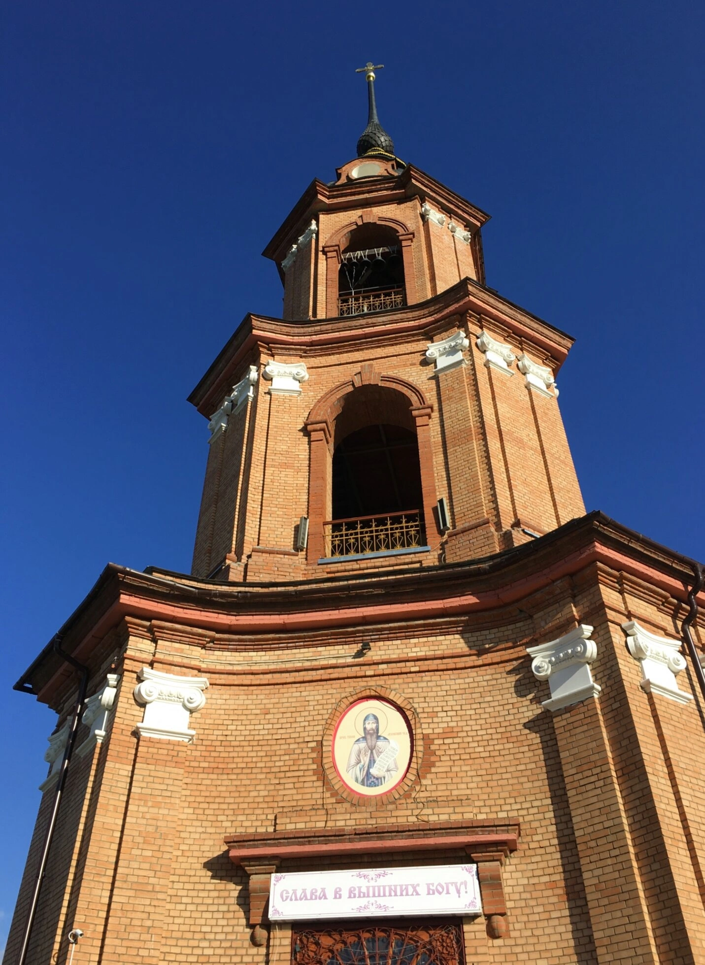 На фасаде, справа от центра, помещена круглая икона, а ниже её – табличка с надписью «СЛАВА В ВЫШНИХ БОГУ!». Эти детали подчёркивают духовное назначение сооружения и его принадлежность к православной традиции. Яркий солнечный свет, падающий на кирпичную кладку, выявляет её фактуру и создаёт контраст с глубоким синим небом, усиливая монументальность образа.