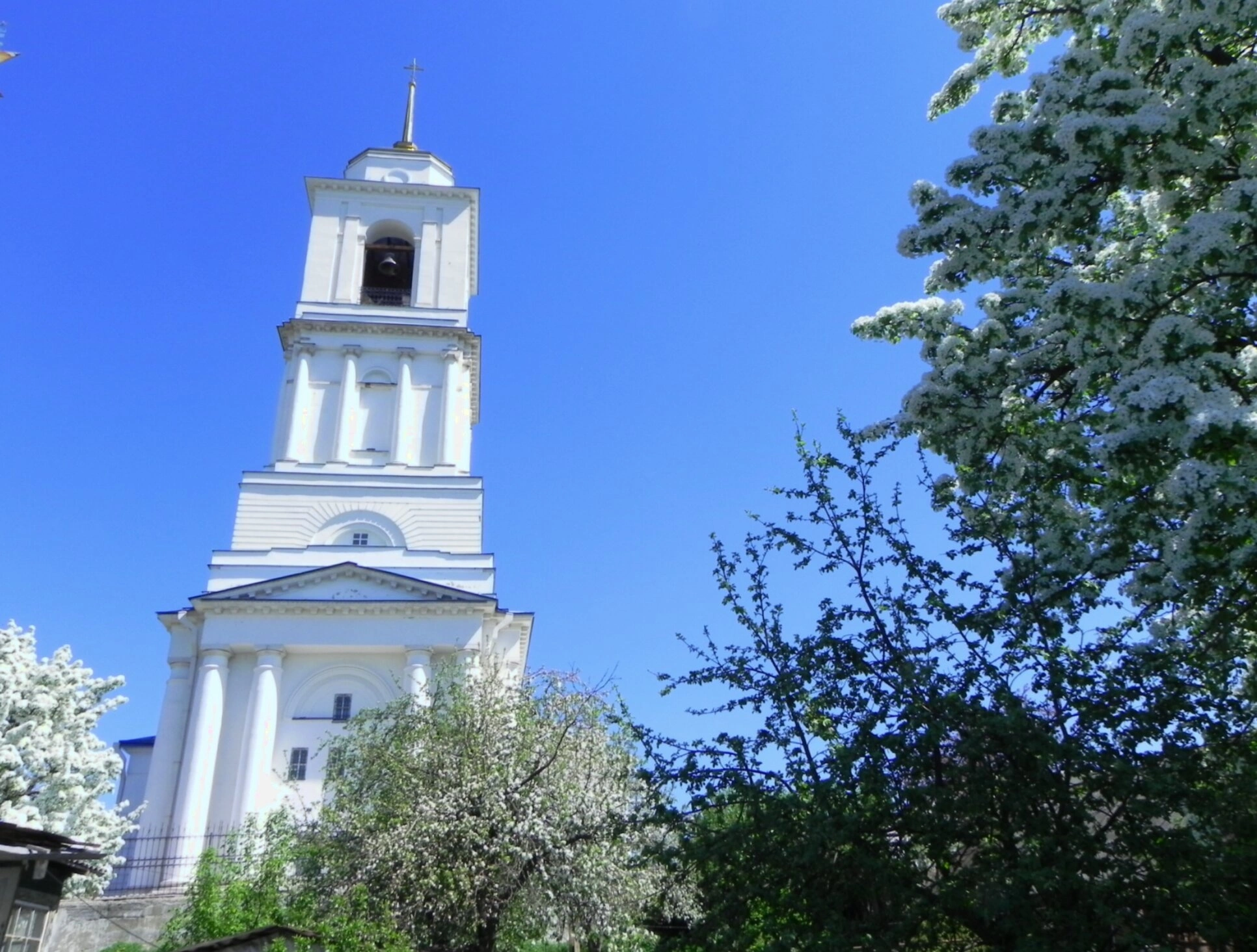На представленной фотографии запечатлена величественная колокольня собора Святителя Николая (Никольского собора) в городе Серпухове Московской области. Многоярусное белокаменное сооружение, увенчанное золочёной главой с воздвигнутым крестом, является ярким образцом русской церковной архитектуры периода классицизма. Чёткие пропорции, арочные проёмы звона и использование ордерной системы колонн придают постройке монументальность и строгое изящество.