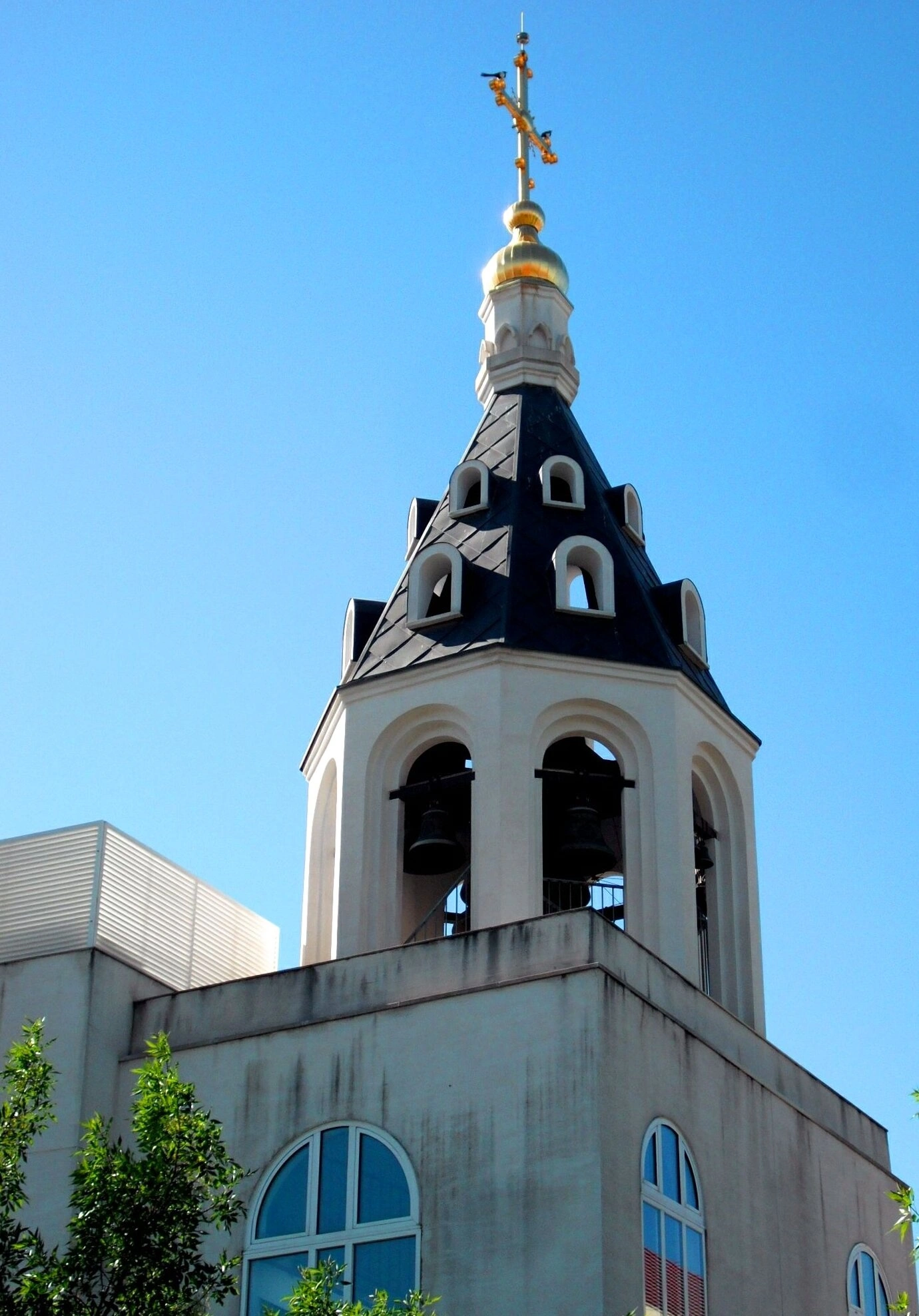 На представленной фотографии запечатлена колокольня кафедрального собора в честь святой равноапостольной Марии Магдалины в Мадриде, являющегося главным храмом Мадридской и Лиссабонской епархии Русской Православной Церкви. Снимок крупным планом показывает верхнюю часть колокольни, увенчанную золочёной главкой, на которой гордо возвышается православный крест, сияющий под испанским солнцем.