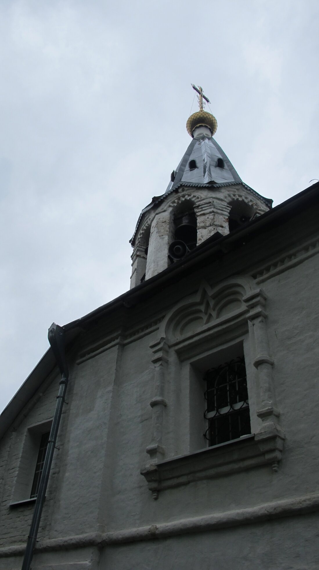 Колокольню венчает изящный луковичный купол, покрытый золотом и увенчанный православным крестом, сияющим даже под пасмурным небом. Основной объём сооружения выполнен из светлого камня и оштукатурен, фасад украшают скромные, но выразительные декоративные элементы: наличники вокруг окон и простые карнизы. Одно из окон второго яруса зарешечено, что свидетельствует о древности постройки.