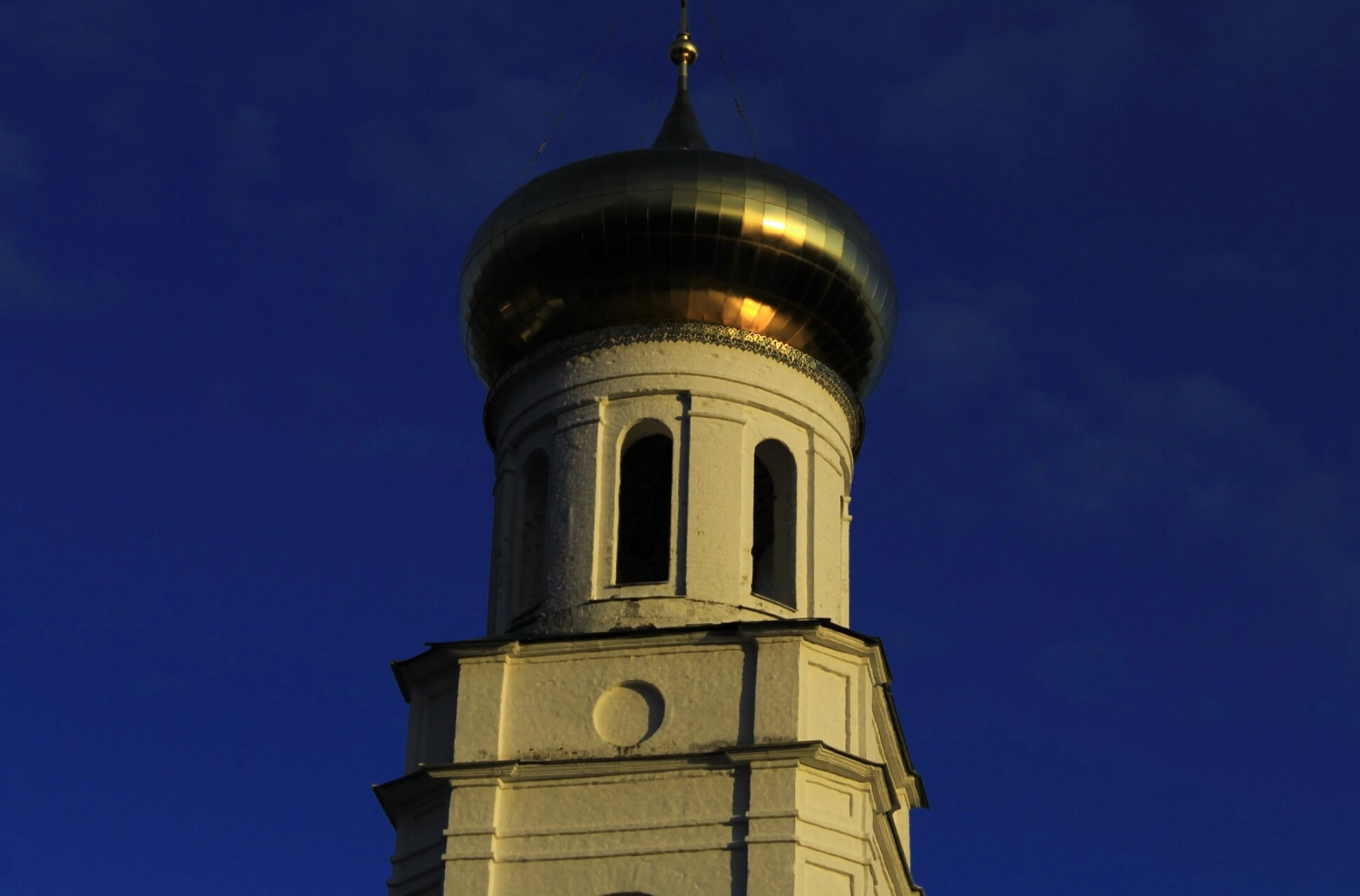 Верхний ярус колокольни, изображённый на снимке, выполнен из белого камня и венчается золочёной главой с водружённым на неё крестом. Ярус звона украшают арочные проёмы, в которых размещаются колокола. В солнечный день купол сияет ослепительным блеском, эффектно контрастируя на фоне бездонного синего неба, что символизирует свет веры и устремлённость к горнему миру.