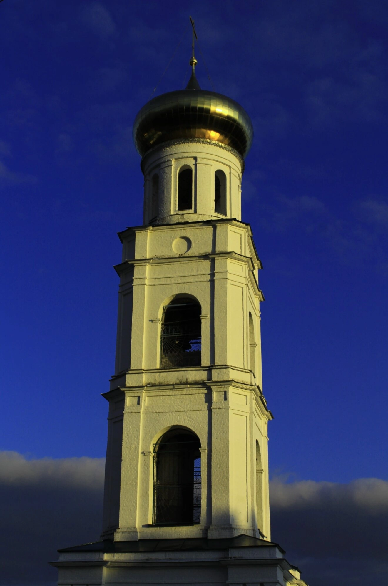 На представленной фотографии запечатлена величественная колокольня Спасо-Преображенского собора, расположенного в историческом центре города Шуи Ивановской области. Это монументальное сооружение, являющееся одним из высочайших православных звонниц в России, достигает высоты 106 метров и доминирует в городском ландшафте.