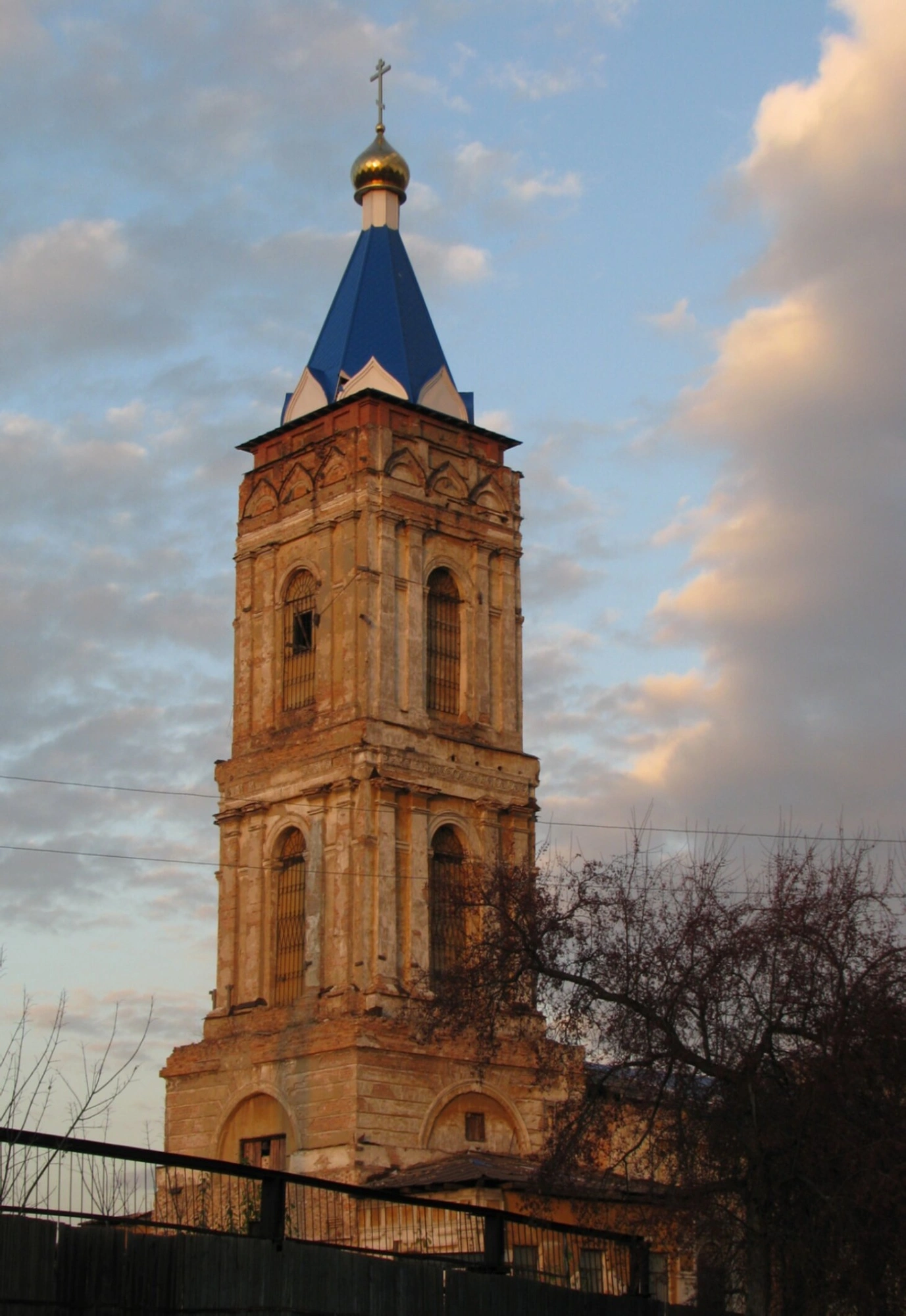 Многоярусная каменная колокольня устремляется в небо, демонстрируя характерные для русского храмового зодчества черты. Арочные проёмы звона, обрамлённые килевидными завершениями, придают сооружению лёгкость и изящество. Фасад украшен скромным, но выразительным декором, подчёркивающим вертикальную динамику постройки.