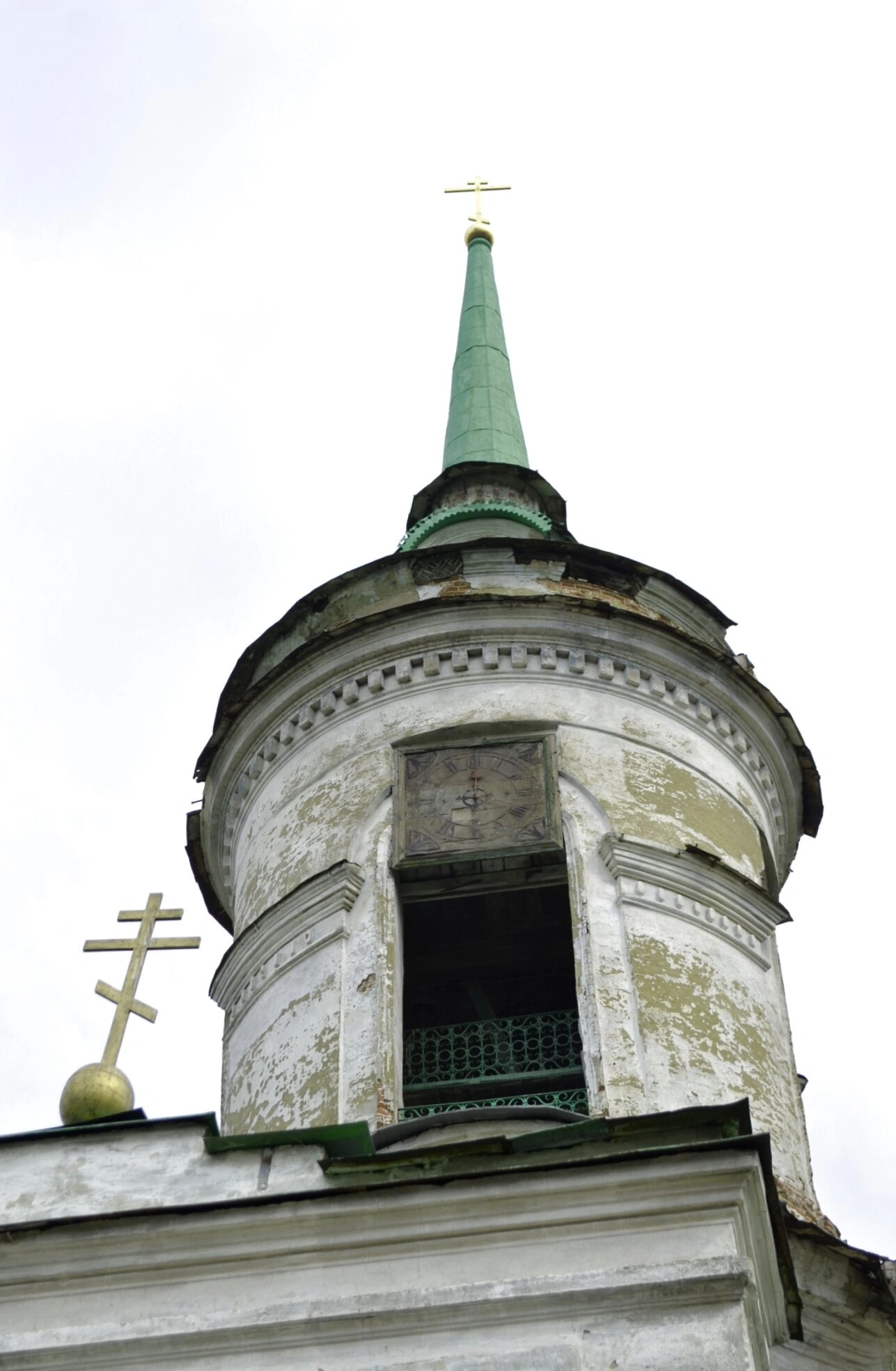 На снимке хорошо видны арочные проёмы яруса звона, через которые льётся благовест над окрестностями, а также детали декоративного убранства – пилястры и наличники. Патина времени на кирпичной кладке и следи естественного старения придают сооружению особый, благоговейный вид, напоминая о долгой и богатой истории этого святого места. Колокольня неразрывно связана с главным объёмом храма, образуя единый молитвенный комплекс, который на протяжении более двух веков является духовным центром для православных жителей окрестных селений.