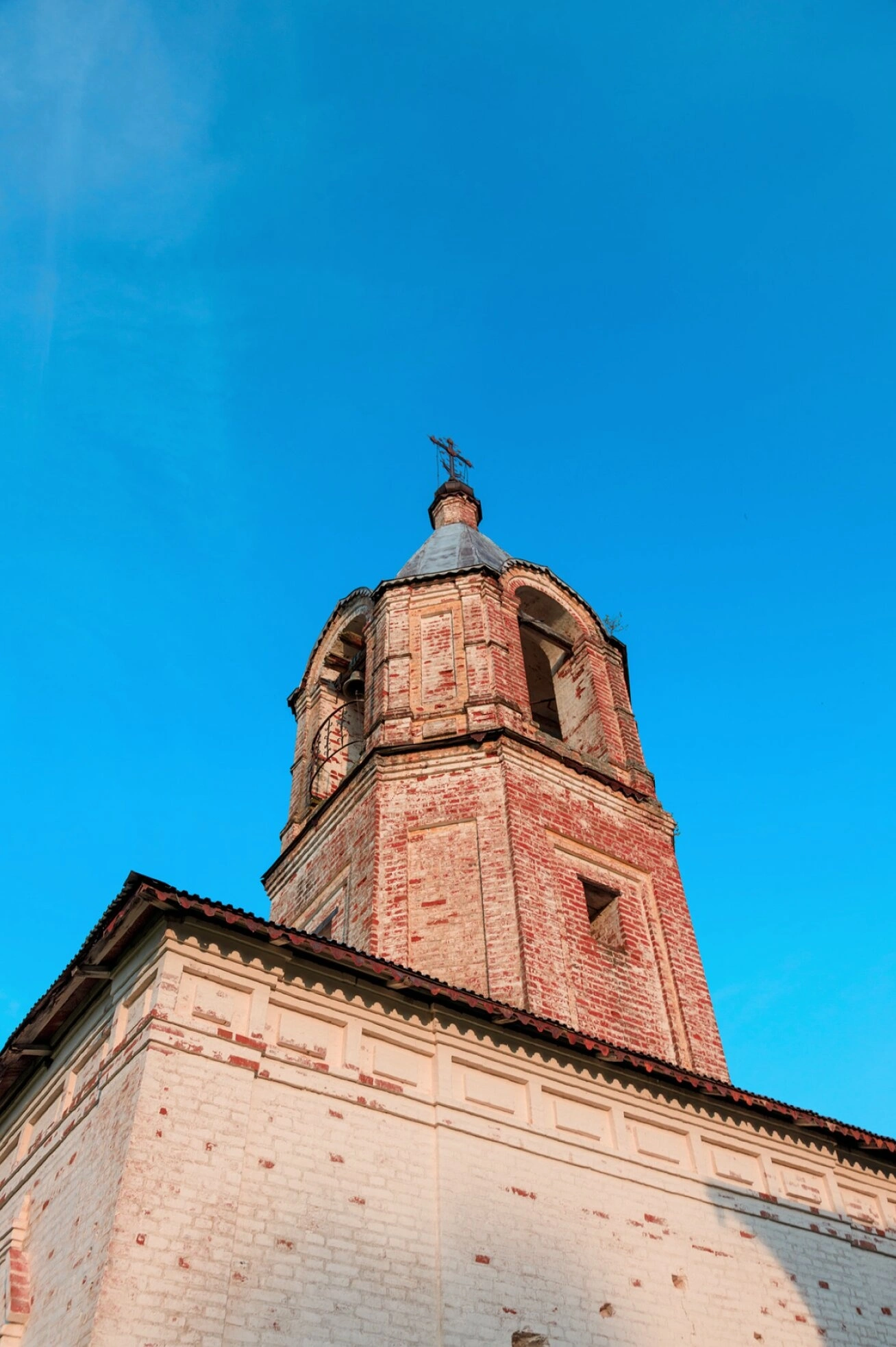 На представленной фотографии запечатлена колокольня Троицкой церкви, расположенной в историческом центре Красноборска Архангельской области. Это значимый памятник православной архитектуры, входящий в реестр объектов культурного наследия Красноборского района.