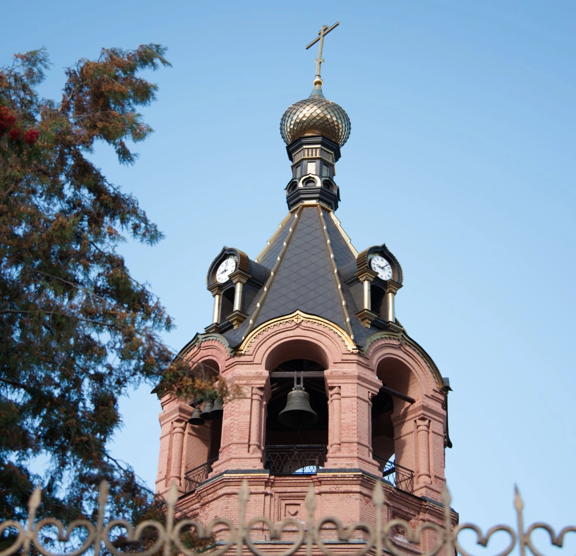 На переднем плане фотографии видна ажурная металлическая ограда, ограждающая храмовую территорию, а слева — ветви дерева с алыми ягодами, символизирующими красоту Божьего мира. Троицкий храм, чью колокольню мы видим, был построен в середине XIX века и является объектом культурного наследия. Это духовный центр города, куда уже более полутора веков стекаются православные верующие для молитвы.