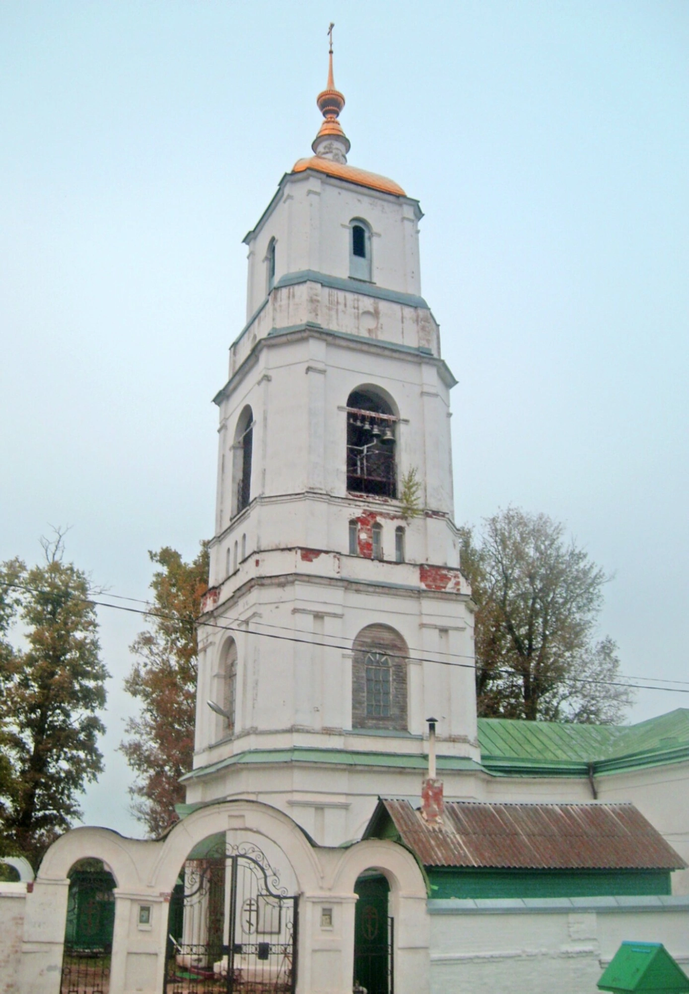 Справа от колокольни просматривается зелёная кровля основного объёма храма, посвящённого Святой Живоначальной Троице. Храм был построен в 1801 году на средства помещика Петра Ильича Бибикова вместо обветшавшей деревянной церкви. В нижней части снимка видна часть ограды с въездными воротами, ведущими на территорию церковного двора.