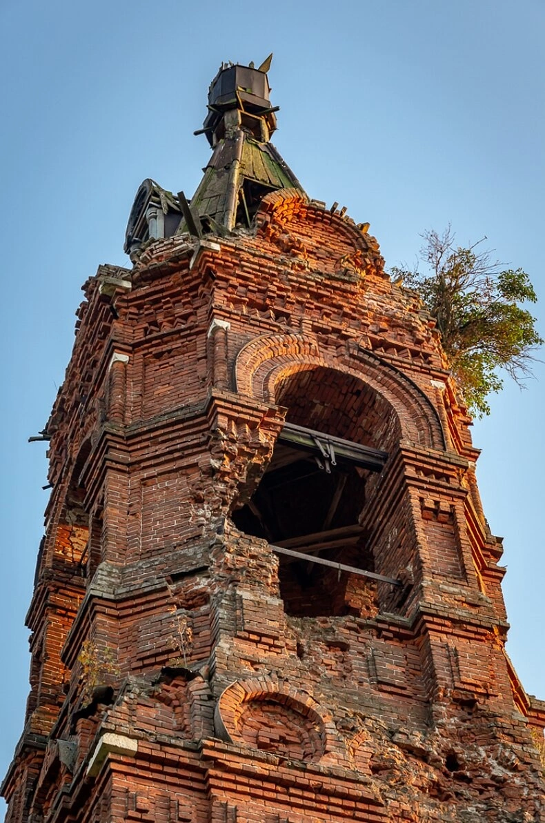 Особенно символичным и поразительным свидетельством силы природы представляется молодое дерево, проросшее прямо из разрушенной кладки на вершине колокольни. Этот образ стал немым укором забвению и одновременно напоминанием о вечном круговороте жизни. На заднем плане фотографии — чистое голубое небо, создающее контраст с земной разрухой и подчёркивающее высоту и стройность когда-то величественного сооружения.