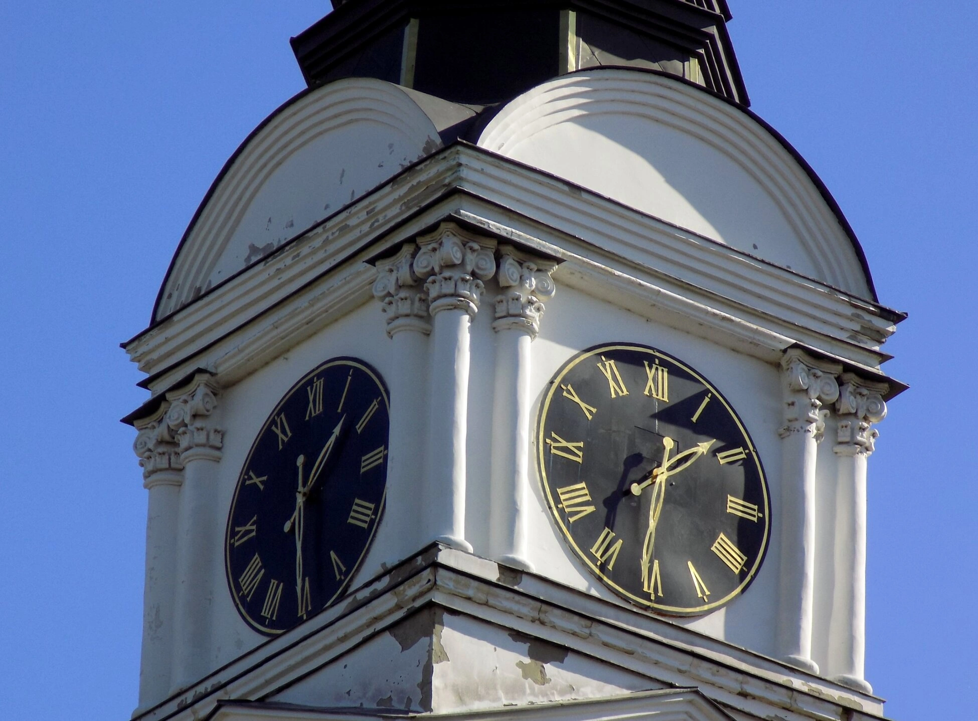 Колокольня выполнена в светлых тонах и украшена декоративными архитектурными элементами, включая колонны и карнизы, что характерно для храмового зодчества. На ярусе звона хорошо видны два циферблата башенных часов, расположенные на разных сторонах. Часы имеют классические стрелки и римские цифры, что придаёт им особый, традиционный для православных колоколен вид.