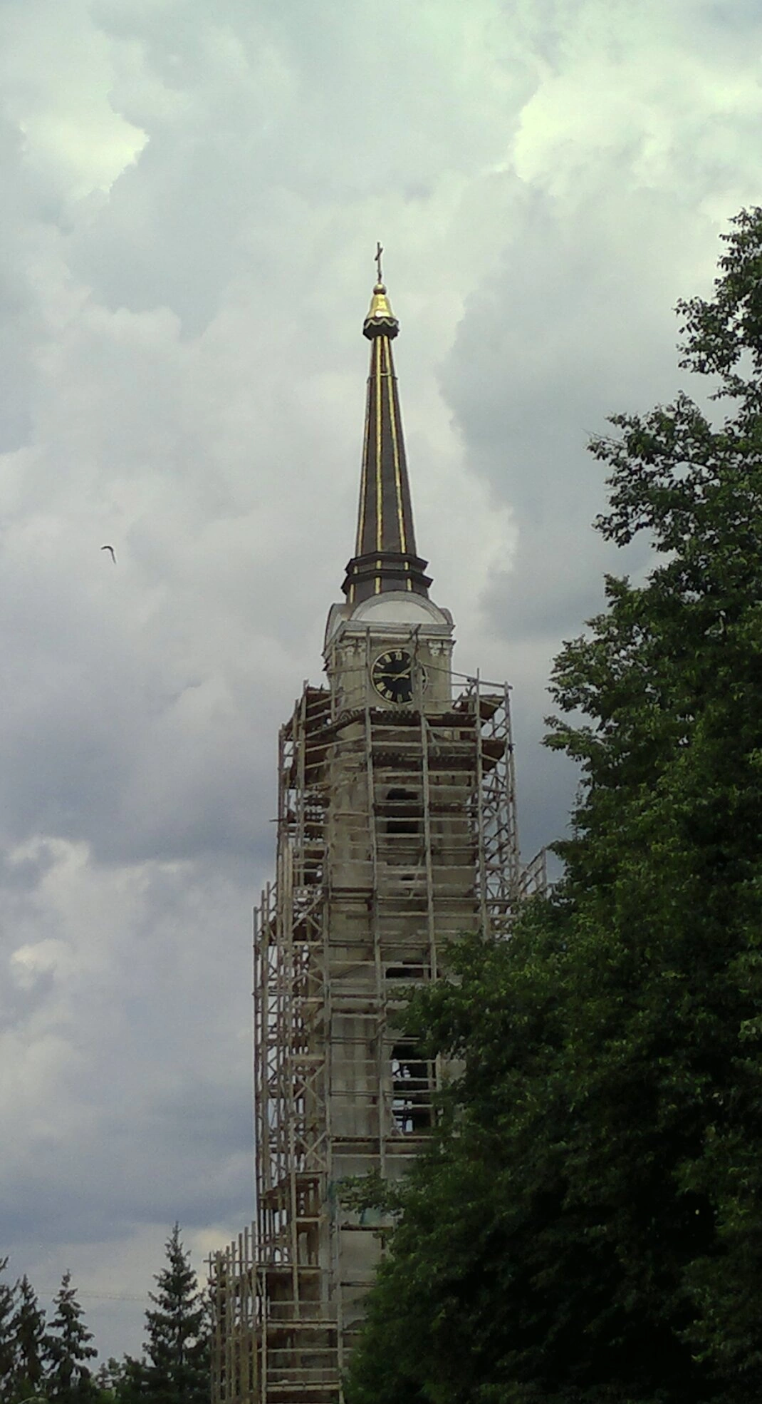 На представленной фотографии запечатлена колокольня Собора Успения Пресвятой Богородицы, что в городе Рыльске Курской области. Многоярусное сооружение окружено строительными лесами, что свидетельствует о проведении масштабных реставрационных или восстановительных работ, направленных на сохранение уникального памятника православной архитектуры.