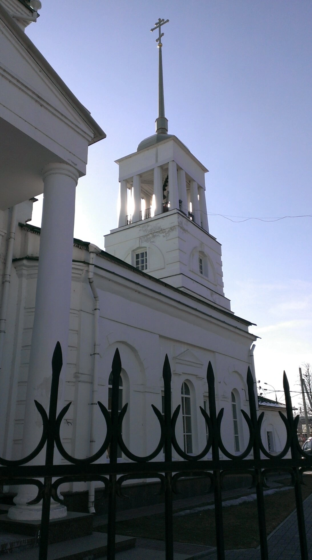 Архитектурный облик колокольни отличается строгой гармонией и благородной простотой. Белые стены, украшенные классическими пилястрами и арочными проёмами, создают ощущение лёгкости и величия. В верхнем ярусе размещена звонница с открытыми проёмами, откуда в дни великих праздников разносится благодатный благовест, созывающий православных верующих на молитву. Снимок сделан снизу вверх, что подчёркивает монументальность сооружения и позволяет оценить его изящные пропорции.