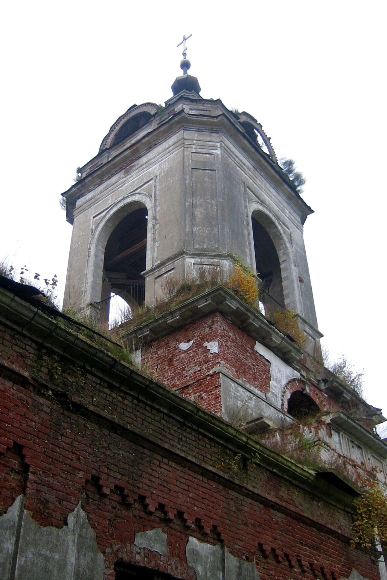 На представленной фотографии запечатлена колокольня некогда величественного храма Успения Пресвятой Богородицы, расположенного в селе Фёдоровское Тверской области. Храм был возведён в 1830 году и являлся духовным центром для жителей окрестных деревень.