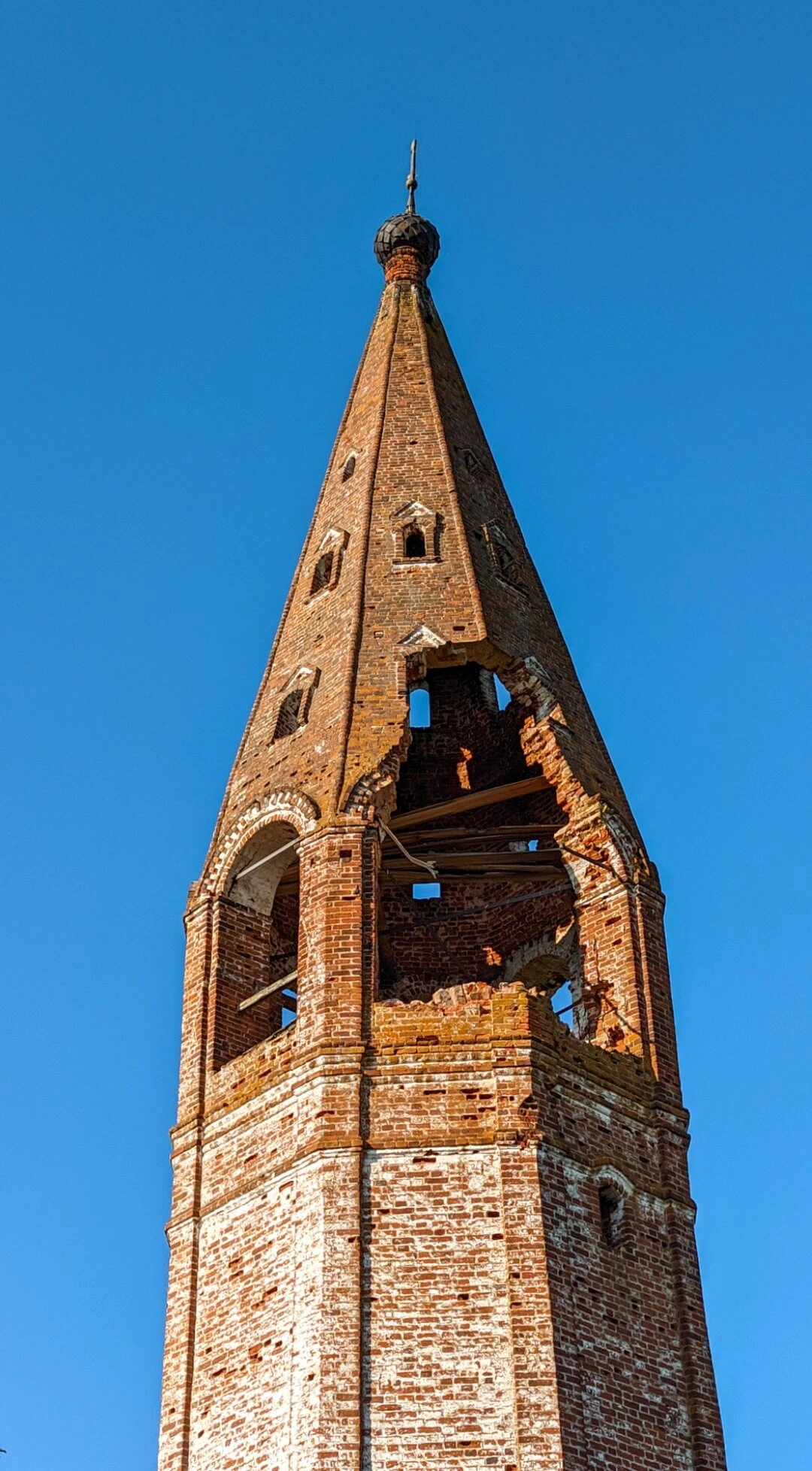 Колокольня сложена из красного кирпича и демонстрирует значительные повреждения, особенно в верхней части, где стены частично обрушились, оставив лишь фрагменты первоначальной конструкции. Кирпичная кладка, несущая на себе печать времени, покрыта природными наслоениями - мхом и лишайниками, что придаёт сооружению особую духовную значимость как свидетельства быстротечности земного бытия.