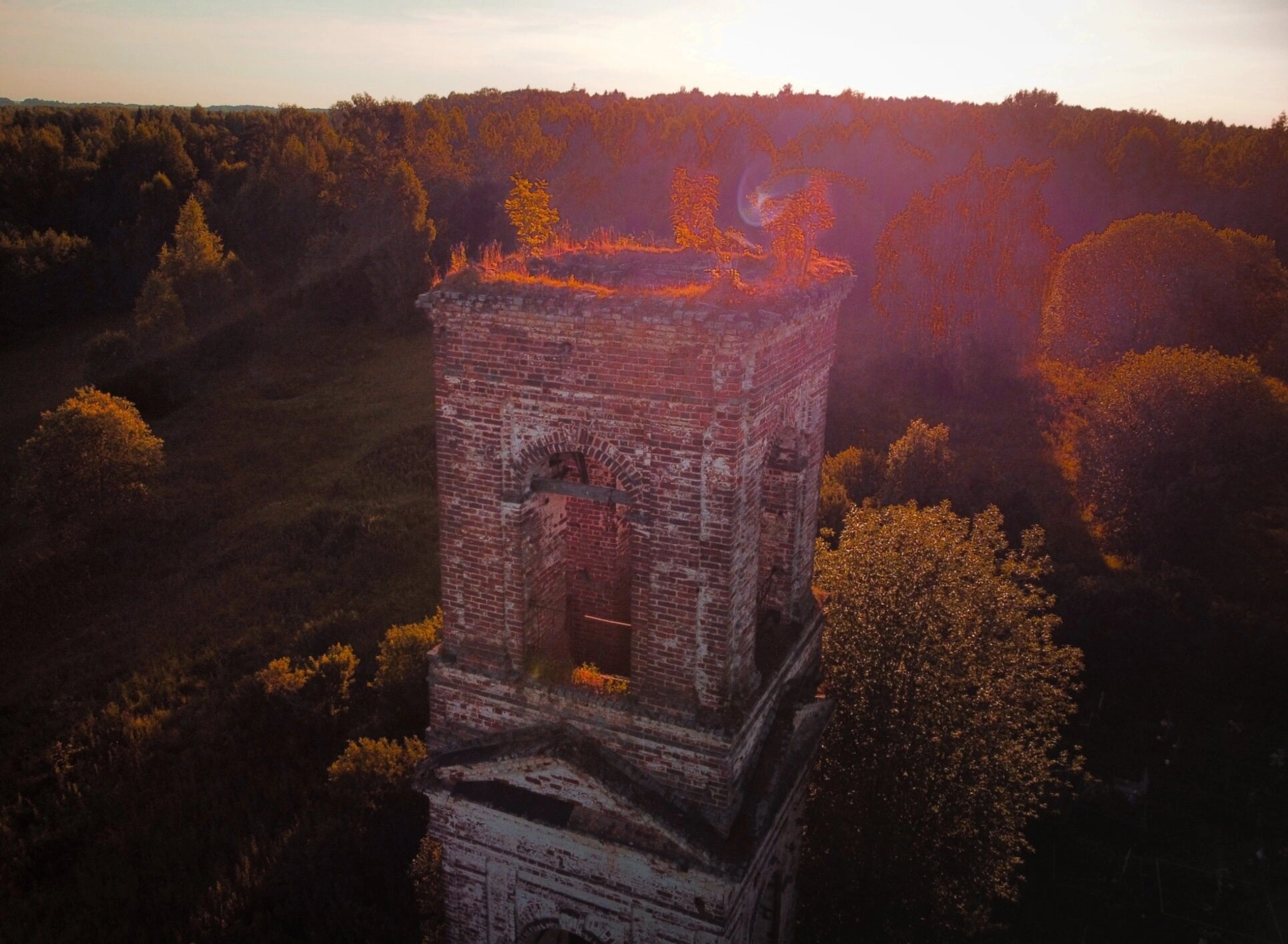 Снимок сделан в час заката, когда последние лучи солнца мягко освещают древние стены, что придаёт всей сцене глубоко меланхоличный и одновременно величественный вид. Лес, окружающий колокольню, подчёркивает её уединённость и оторванность от мира живых. Эта колокольня — немой свидетель ушедшей эпохи, молчаливый хранитель памяти о молитвах, которые когда-то возносились под её сводами. Она стоит как напоминание о бренности всего земного и призывает к сохранению оставшегося историко-культурного наследия православной Руси.