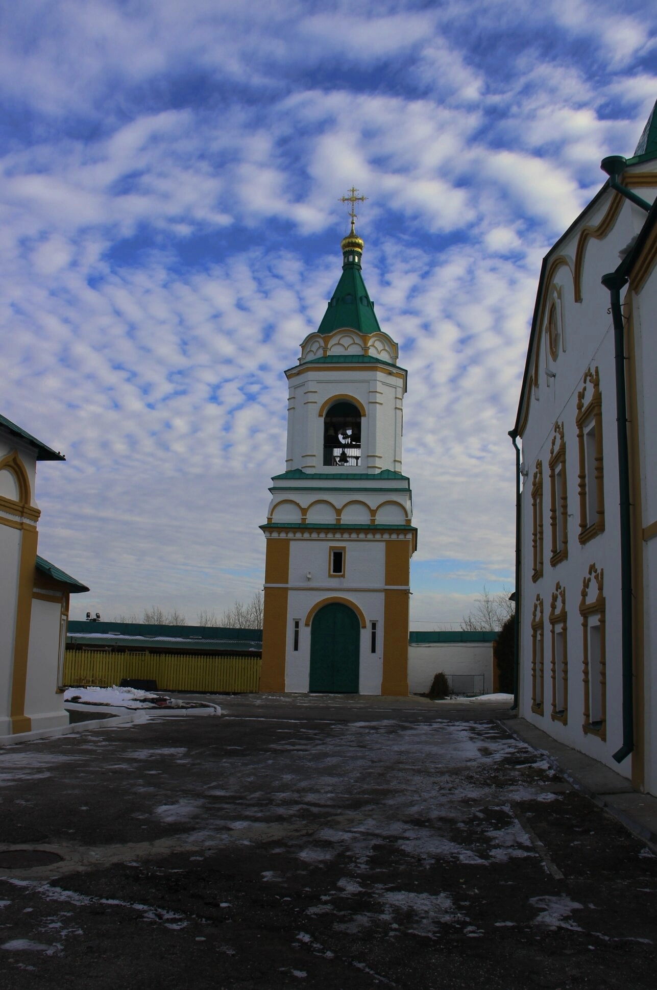 Монастырская колокольня, увенчанная золоченым куполом и сияющим на солнце православным крестом, выполнена в традициях русского церковного зодчества. Её стройный силуэт, белоснежные стены с арочными проёмами и тёплые охристые декоративные элементы создают образ одновременно величественный и благолепный. Колокольня является неотъемлемой частью святых врат, через которые верующие попадают на территорию монастыря, оставляя суетный мир за спиной.