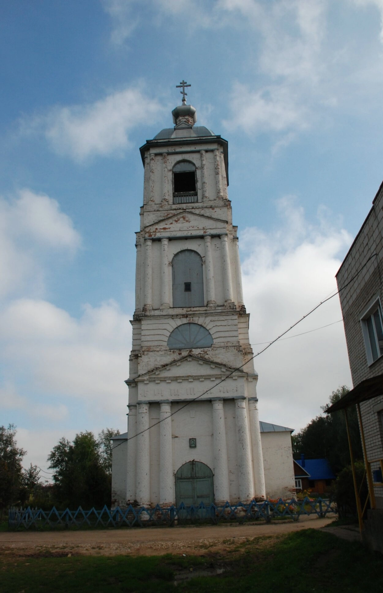 Колокольня, выступающая центральным элементом снимка, представляет собой величественное сооружение, выполненное в традициях русского церковного зодчества. Её ярусная композиция, увенчанная куполом и главкой с православным крестом, устремляется в небо, символизируя молитвенное горение и устремлённость к Богу. В прежние времена с её звонницы разносился благовест, созывавший верующих на богослужение и освящавший окрестные поля и деревни.