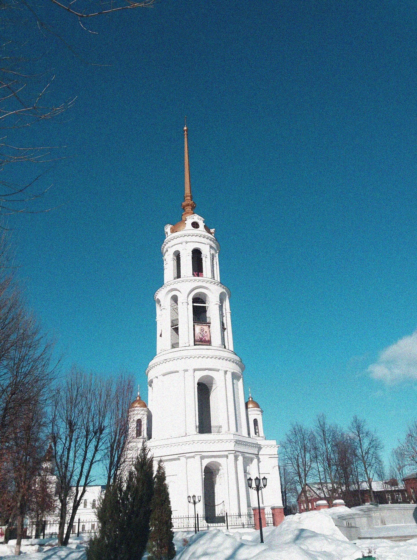 На представленной фотографии запечатлена величественная колокольня Собора Воскресения Христова в историческом городе Шуя Ивановской области. Снимок сделан в зимнее время, когда заснеженный пейзаж подчёркивает монументальность и строгую красоту этого выдающегося архитектурного сооружения.