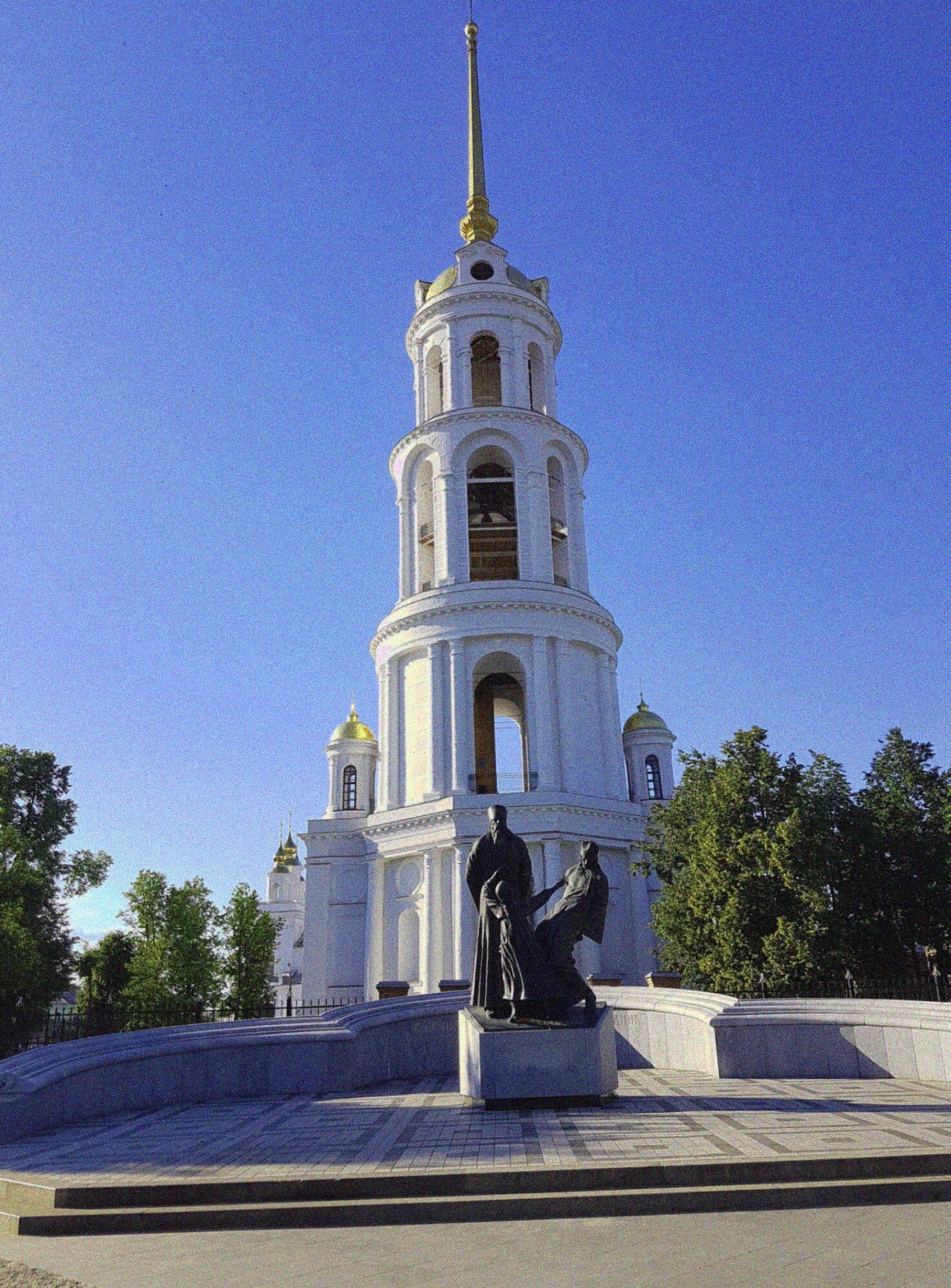 Доминантой композиции выступает стройная многоярусная колокольня, выполненная в классическом стиле. Её белоснежные стены устремляются ввысь, увенчанные золочёным шпилем, который сияет в лучах солнца. Высота колокольни составляет сто шесть метров, что делает её одной из самых высоких православных звонниц в России. Рядом виднеются тёмные главки самого собора, покрытые практичным кровельным железом.
