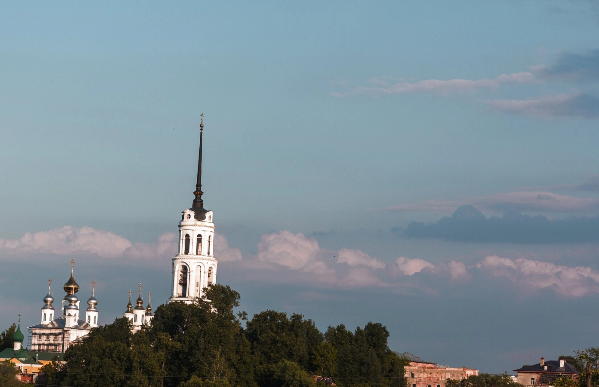 На представленной фотографии запечатлена величественная колокольня Собора Воскресения Христова в городе Шуе Ивановской области. Это монументальное сооружение, вознёсшееся на высоту более ста шести метров, является архитектурной доминантой города и одним из символов православного зодчества России первой половины XIX века.