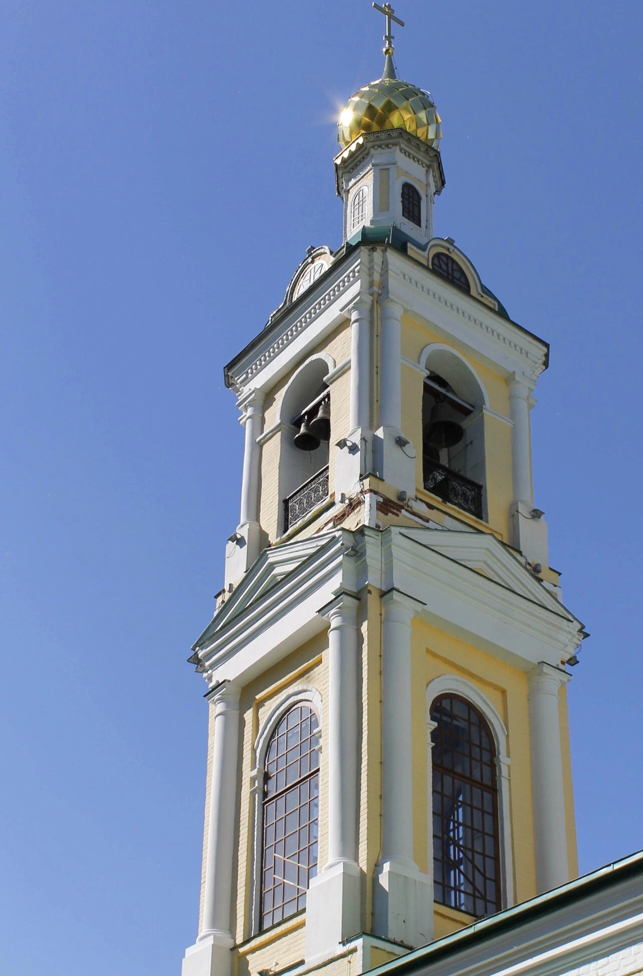 Колокольня, возведённая в стиле русского классицизма, демонстрирует благородство форм и строгость линий, характерных для церковной архитектуры конца XVIII столетия. Её мощный четвериковый ярус служит надёжным основанием для последующих восьмериков, увенчанных изящным золочёным куполом и сияющим православным крестом, устремлённым в небесную высь. Арочные проёмы, предназначенные для церковных колоколов, обрамлены белоснечными колоннами и декоративными элементами, подчёркивающими монументальность и в то же время лёгкость всего строения.