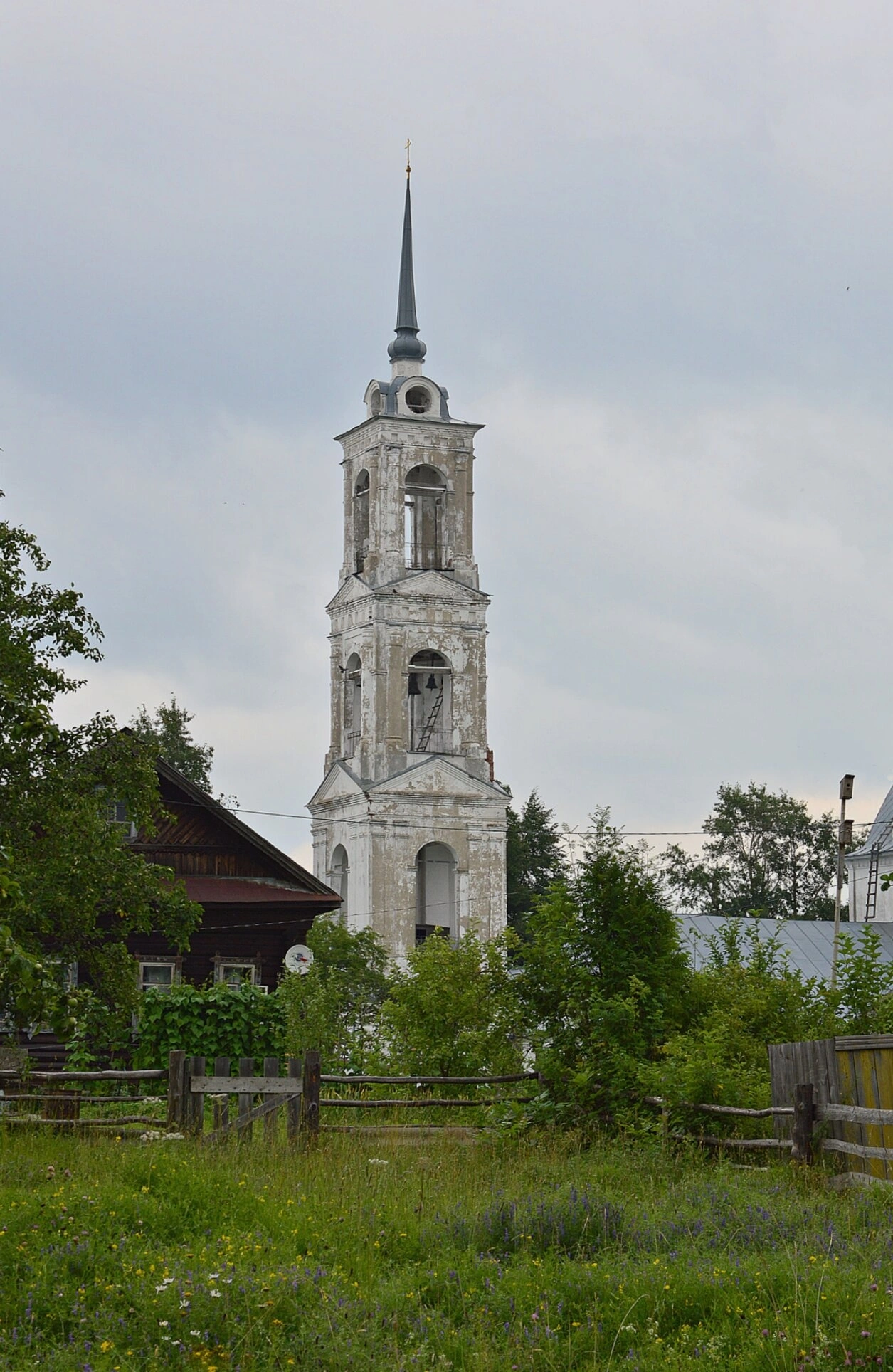 На представленной фотографии запечатлена колокольня утраченного ныне храма Воскресения Христова, что располагался в селе Нежитино Костромской губернии. Многоярусное сооружение, выполненное в строгих канонах классицизма, горделиво возносится над скромным сельским пейзажем, являя собой немой укор времени и напоминание о былом величии православной веры в русской глубинке.