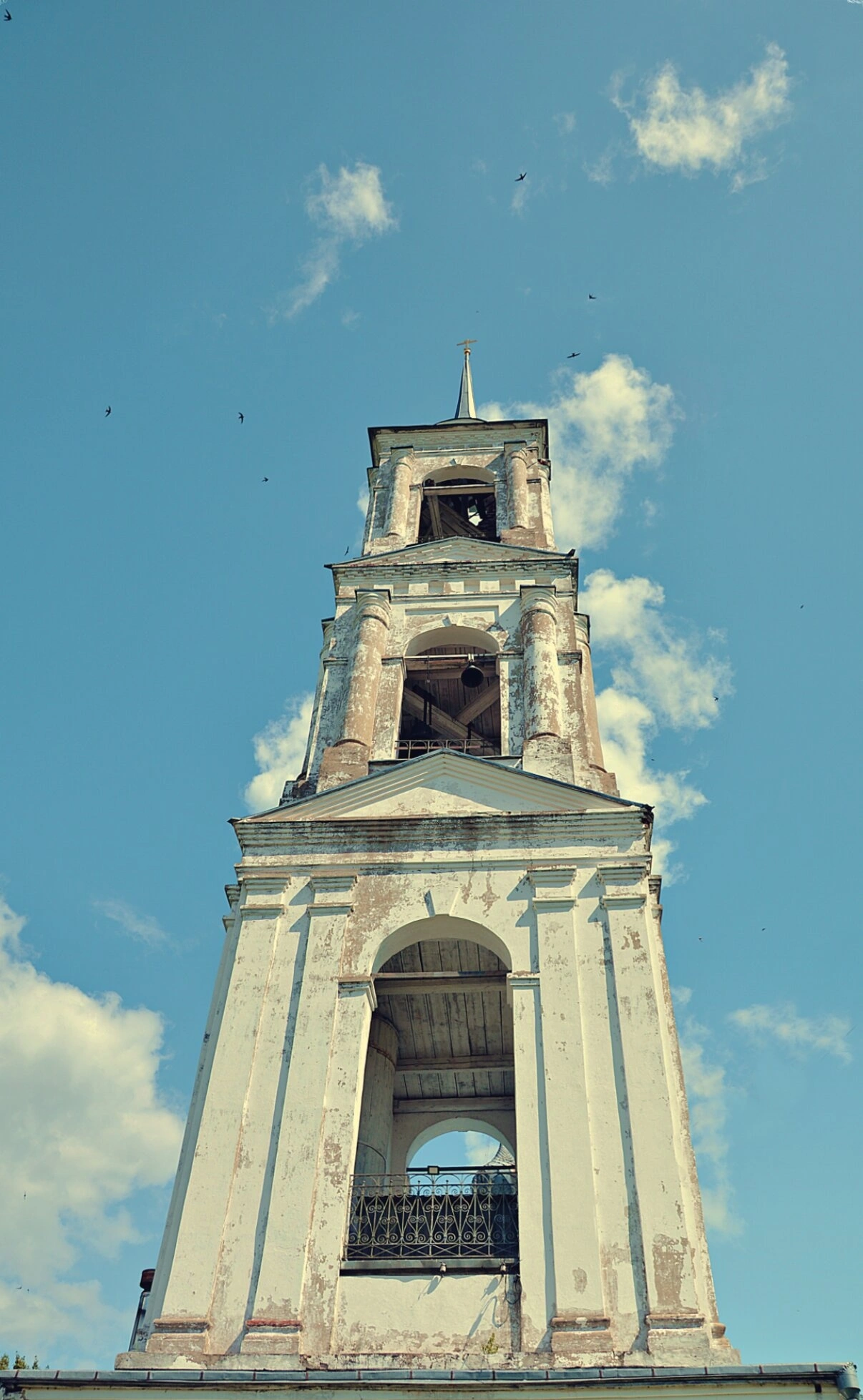 На представленной фотографии запечатлена величественная колокольня Церкви Воскресения Христова, что располагается в старинном селе Нежитино Костромской области. Снимок выполнен с нижнего ракурса, что позволяет в полной мере оценить монументальность сооружения и изящество его архитектурного убранства, устремлённого ввысь, к небесам.