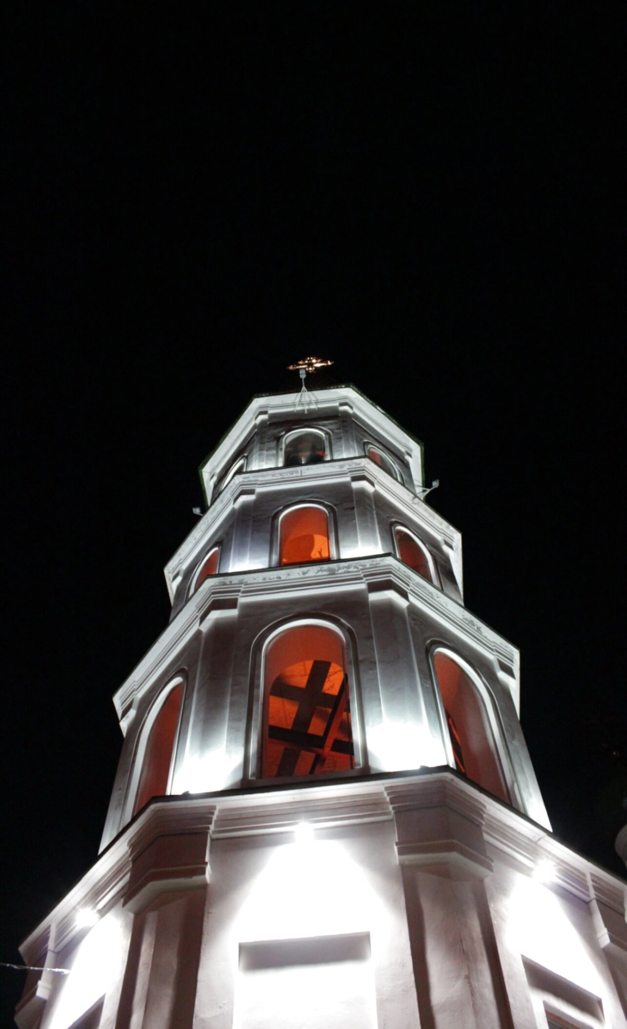 На представленной фотографии запечатлена колокольня собора Вознесения Господня в городе Йошкар-Оле, освещённая в тёмное время суток. Мягкий искусственный свет выгодно подчёркивает архитектурное величие и благолепие одной из главных православных святынь Республики Марий Эл. Колокольня, увенчанная золочёным крестом, устремляется в небо, символизируя молитвенное предстояние перед Господом.