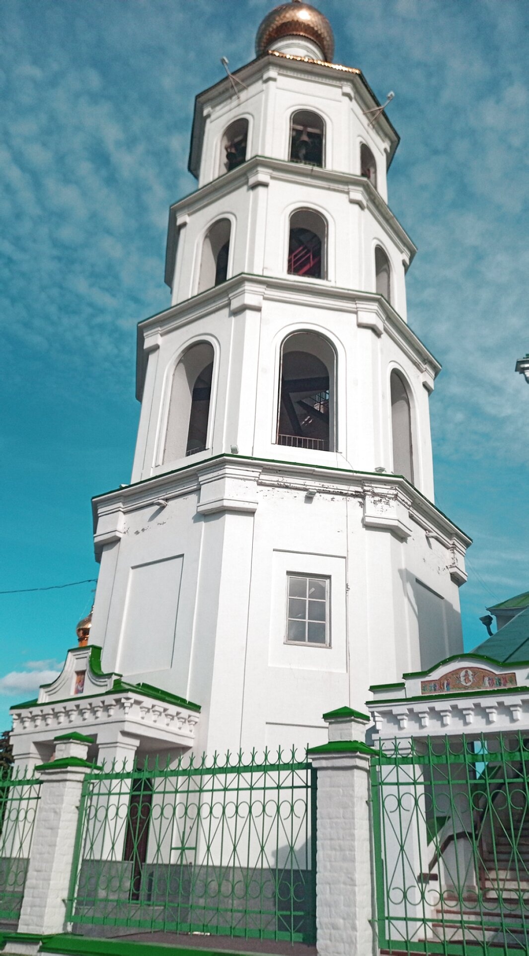 Фотография передаёт не только архитектурные особенности колокольни, но и её сакральное значение как молитвенного места, где земное встречается с небесным.