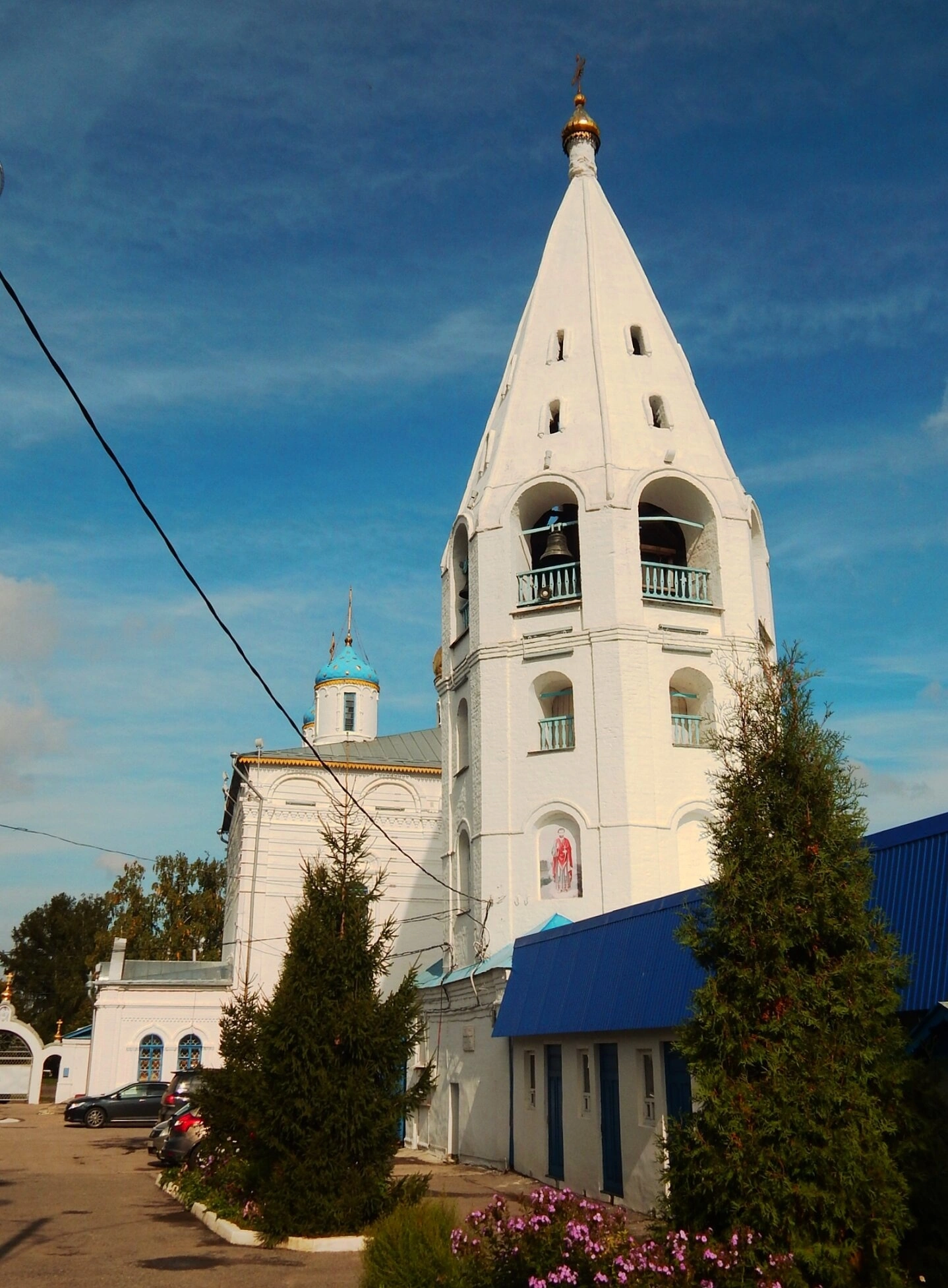На представленной фотографии запечатлена колокольня кафедрального Введенского собора — старейшего православного храма города Чебоксары и всей Чувашской Республики. Белоснежная колокольня, являющаяся архитектурной доминантой комплекса, возвышается над прилегающей территорией, демонстрируя строгие и величественные формы. Её ярусы, увенчанные луковичной главкой с православным крестом, устремляются в небо, символизируя молитвенное предстояние перед Господом.