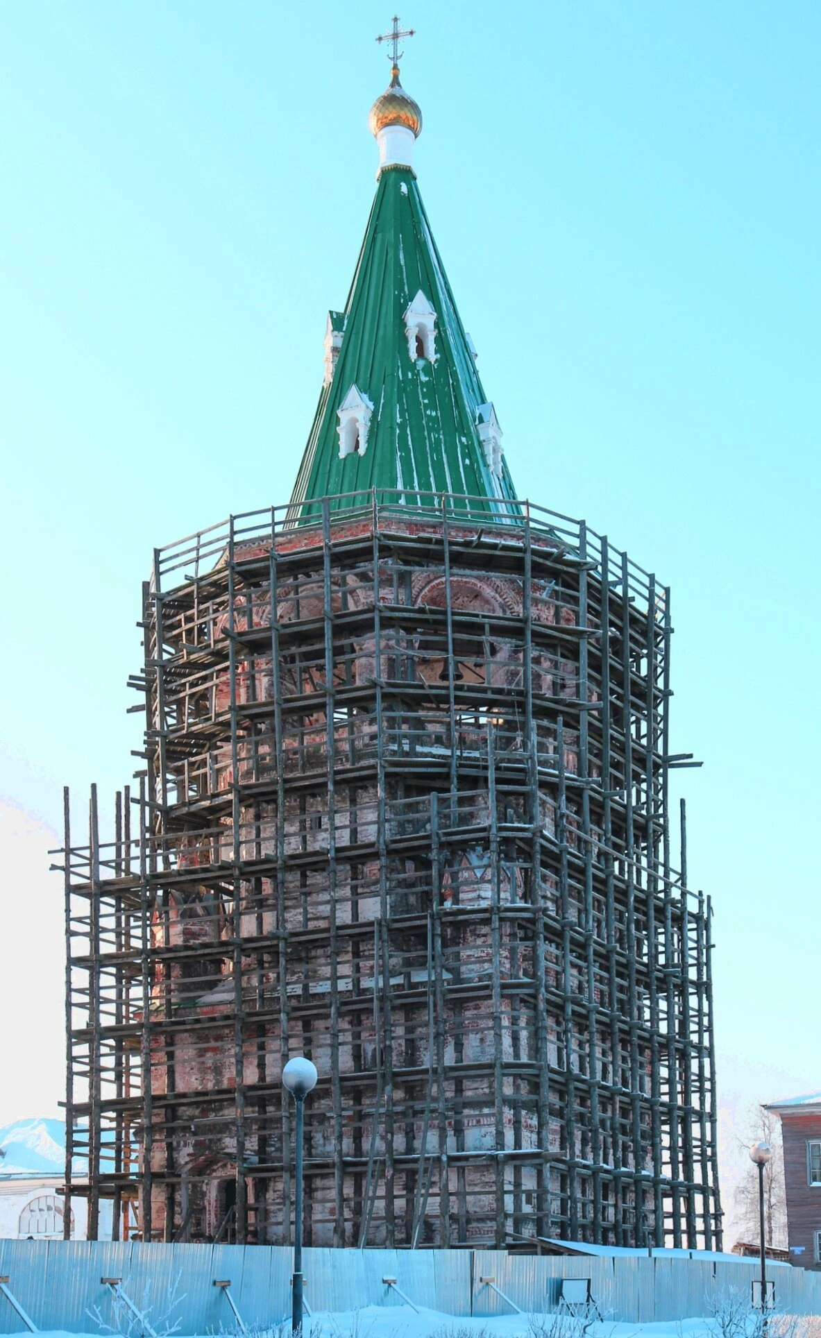 На представленной фотографии запечатлена колокольня Введенской церкви, расположенной в селе Хаврогоры Холмогорского района Архангельской области. Колокольня находится в процессе реставрации, о чем свидетельствуют установленные по всему ее периметру деревянные строительные леса.